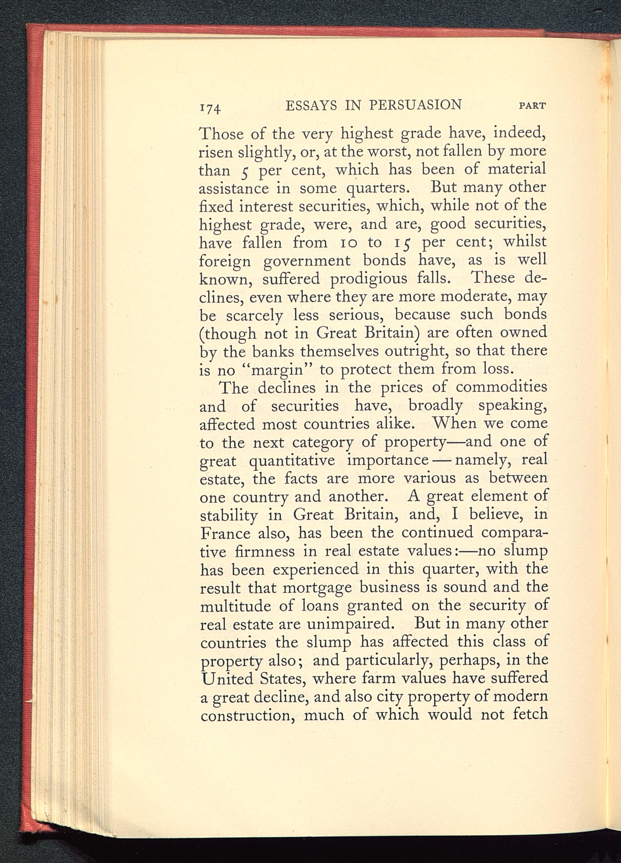 The declines in the prices of commoditiesand of securities have, broadly speaking,affected most countries alike. When we cometo the next category of property—and one ofgreat quantitative importance — namely, realestate, the facts are more various as betweenone country and another. A great element ofstability in Great Britain , and, I believe, inFrance also, has been the continued compara-tive firmness in real estate values:—no slumphas been experienced in this quarter, with theresult that mortgage business is sound and themultitude of loans granted on the security ofreal estate are unimpaired. But in many othercountries the slump has affected this class ofproperty also; and particularly, perhaps, in theUnited States , where farm values have suffereda great decline, and also city property of modernconstruction, much of which would not fetch