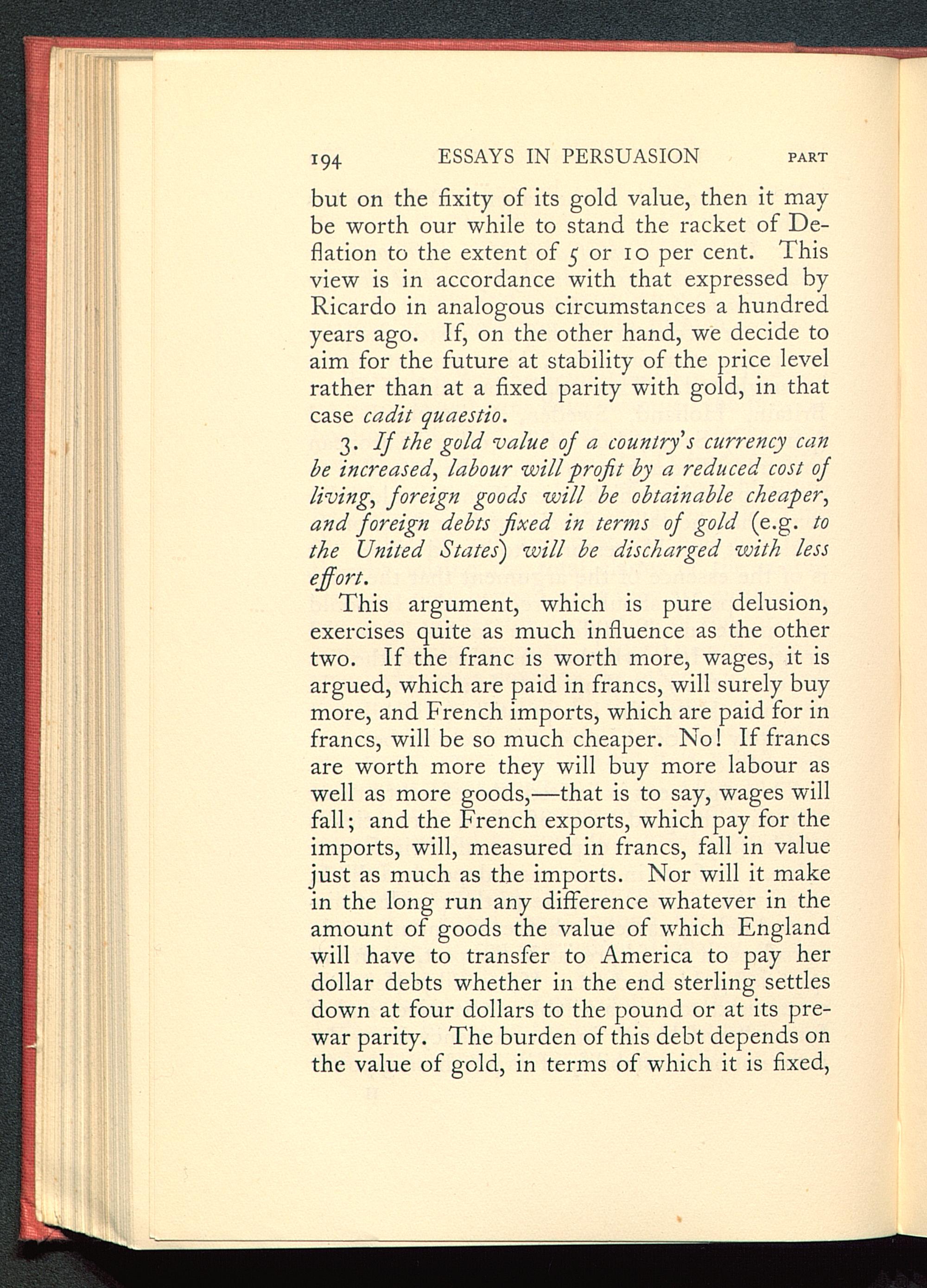 This argument, which is pure delusion,exercises quite as much influence as the othertwo. If the franc is worth more, wages, it isargued, which are paid in francs, will surely buymore, and French imports, which are paid for infrancs, will be so much cheaper. No! If francsare worth more they will buy more labour aswell as more goods,—that is to say, wages willfall; and the French exports, which pay for theimports, will, measured in francs, fall in valuejust as much as the imports. Nor will it makein the long run any difference whatever in theamount of goods the value of which Englandwill have to transfer to America to pay herdollar debts whether in the end sterling settlesdown at four dollars to the pound or at its pre-war parity. The burden of this debt depends onthe value of gold, in terms of which it is fixed,