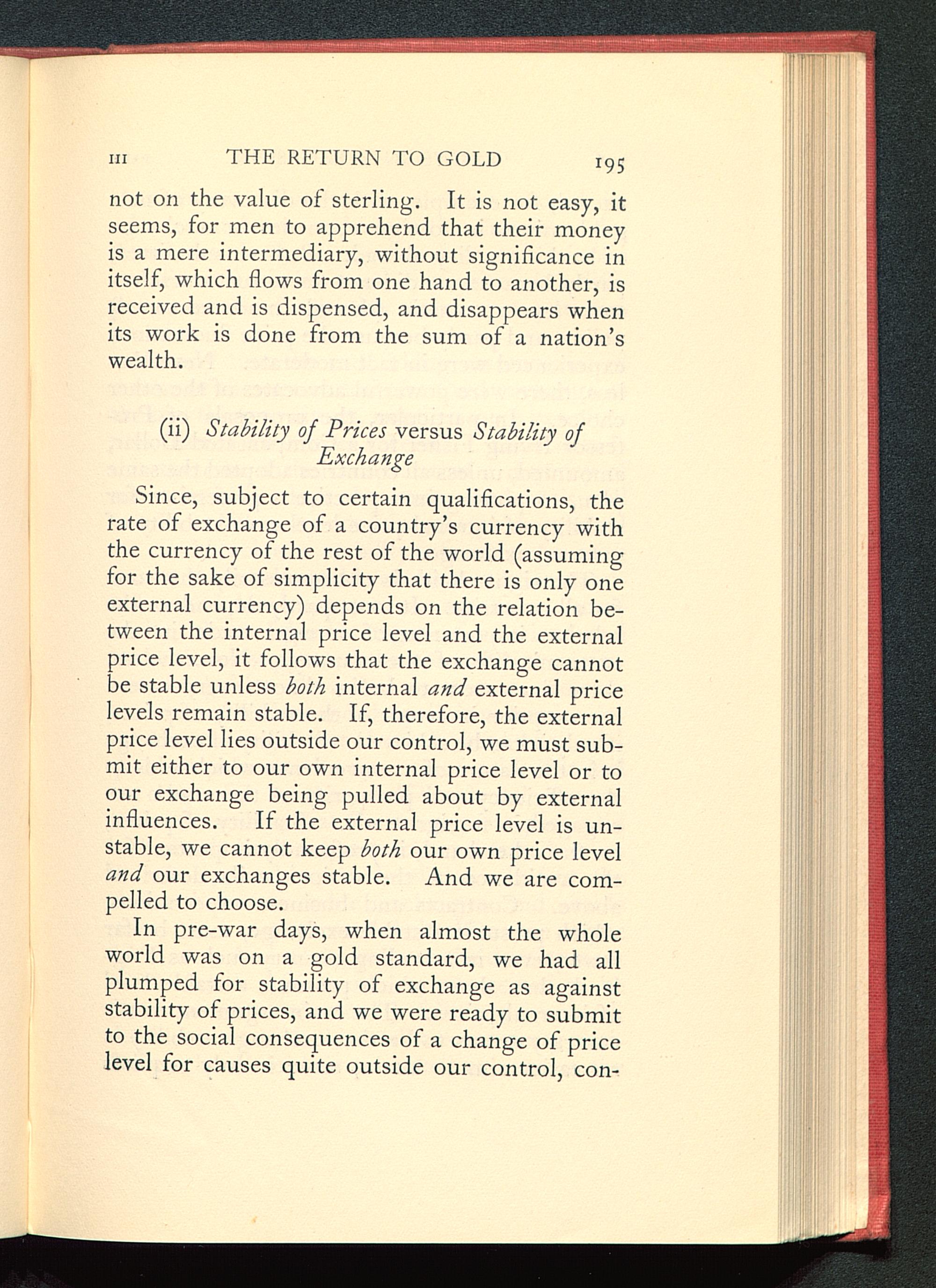 Since, subject to certain qualifications, therate of exchange of a country’s currency withthe currency of the rest of the world (assumingfor the sake of simplicity that there is only oneexternal currency) depends on the relation be-tween the internal price level and the externalprice level, it follows that the exchange cannotbe stable unless both internal and external pricelevels remain stable. If, therefore, the externalprice level lies outside our control, we must sub-mit either to our own internal price level or toour exchange being pulled about by externalinfluences. If the external price level is un-stable, we cannot keep both our own price leveland our exchanges stable. And we are com-pelled to choose.
