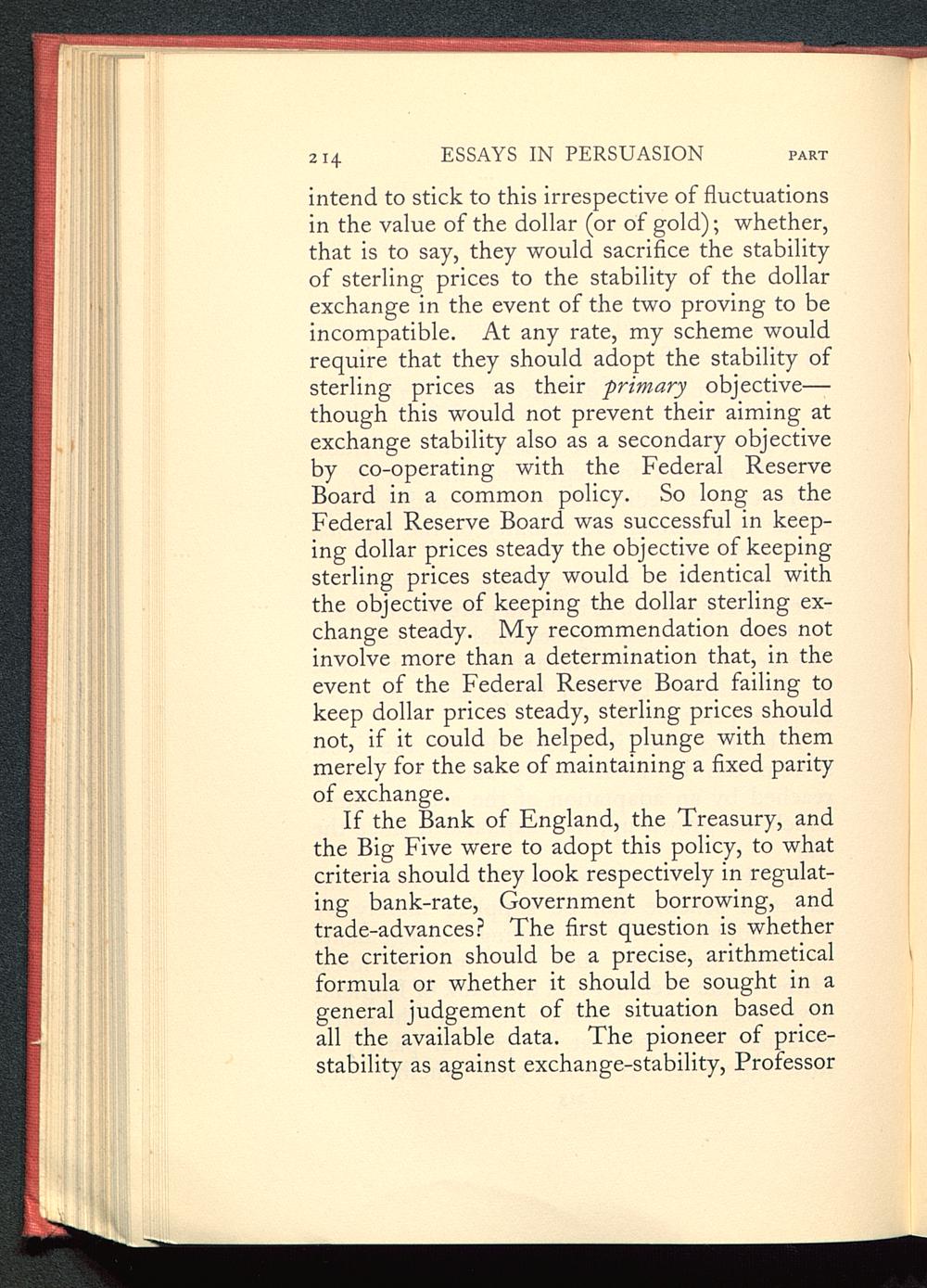 If the Bank of England, the Treasury, andthe Big Five were to adopt this policy, to whatcriteria should they look respectively in regulat-ing bank-rate, Government borrowing, andtrade-advances? The first question is whetherthe criterion should be a precise, arithmeticalformula or whether it should be sought in ageneral judgement of the situation based onall the available data. The pioneer of price-stability as against exchange-stability, Professor