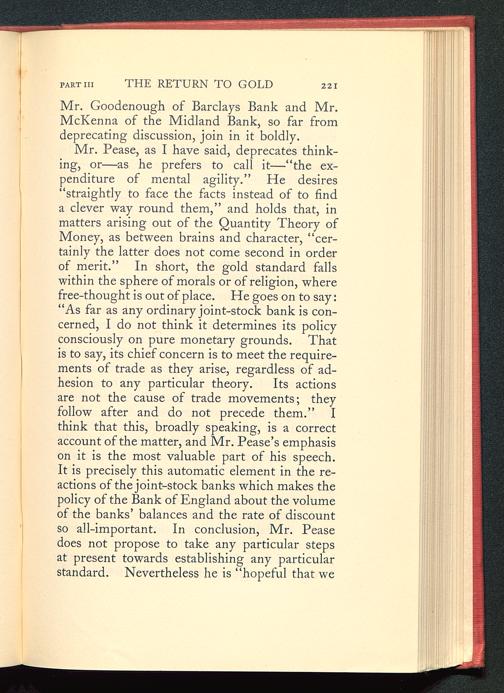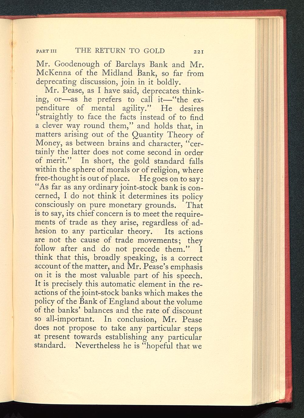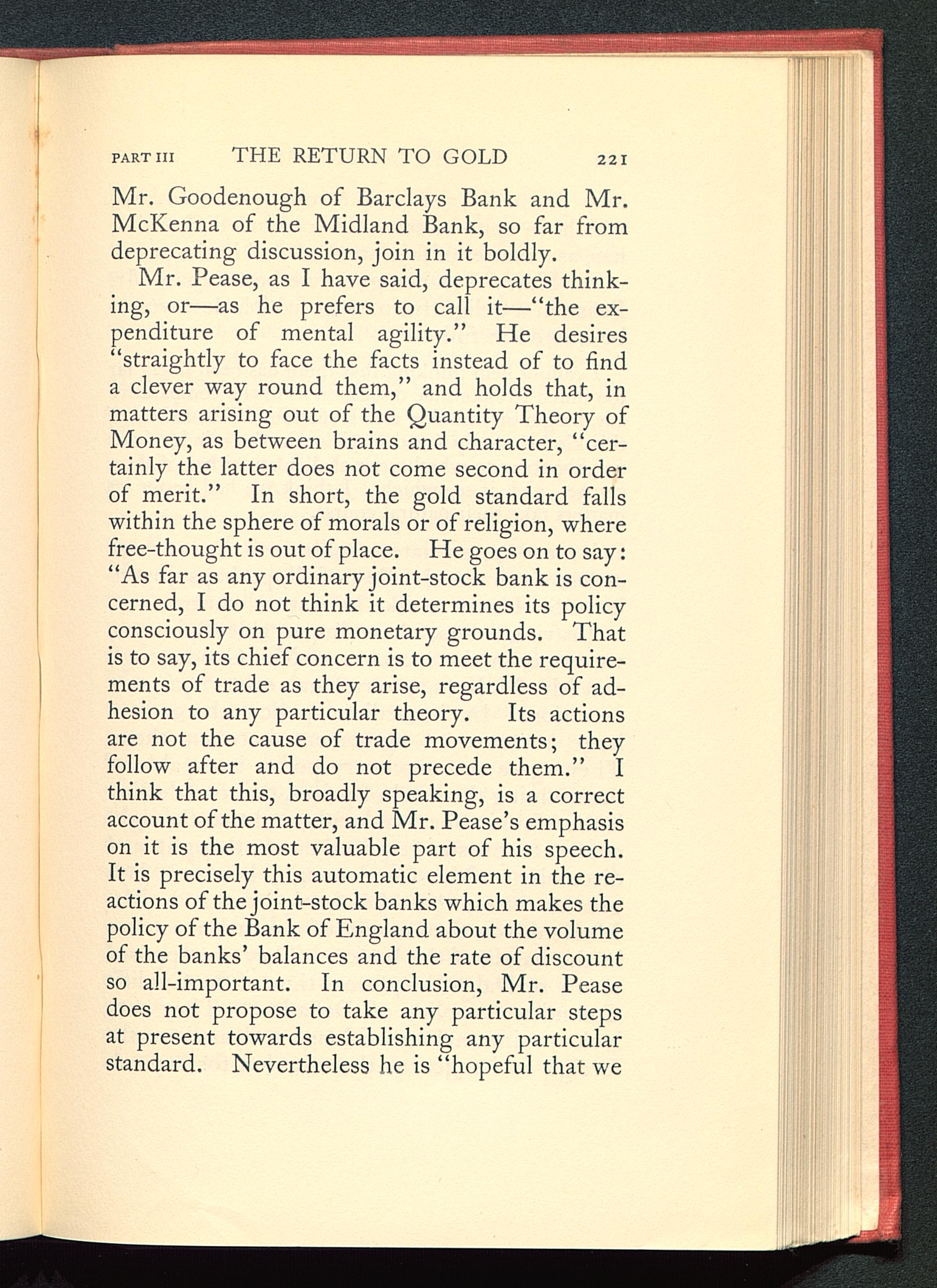 Mr. Pease, as I have said, deprecates think-ing, or—as he prefers to call it—“the ex-penditure of mental agility.” He desires“straightly to face the facts instead of to finda clever way round them,” and holds that, inmatters arising out of the Quantity Theory ofMoney, as between brains and character, “cer-tainly the latter does not come second in orderof merit.” In short, the gold standard fallswithin the sphere of morals or of religion, wherefree-thought is out of place. He goes on to say:“As far as any ordinary joint-stock bank is con-cerned, I do not think it determines its policyconsciously on pure monetary grounds. Thatis to say, its chief concern is to meet the require-ments of trade as they arise, regardless of ad-hesion to any particular theory. Its actionsare not the cause of trade movements; theyfollow after and do not precede them.” Ithink that this, broadly speaking, is a correctaccount of the matter, and Mr. Pease’s emphasison it is the most valuable part of his speech.It is precisely this automatic element in the re-actions of the joint-stock banks which makes thepolicy of the Bank of England about the volumeof the banks’ balances and the rate of discountso all-important. In conclusion, Mr. Peasedoes not propose to take any particular stepsat present towards establishing any particularstandard. Nevertheless he is “hopeful that we