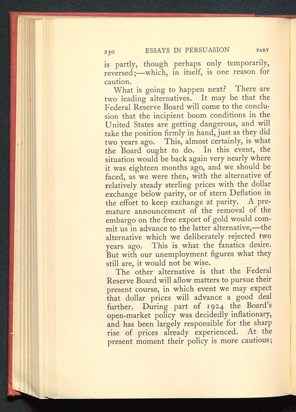 What is going to happen next? There aretwo leading alternatives. It may be that theFederal Reserve Board will come to the conclu-sion that the incipient boom conditions in theUnited States are getting dangerous, and willtake the position firmly in hand, just as they didtwo years ago. This, almost certainly, is whatthe Board ought to do. In this event, thesituation would be back again very nearly whereit was eighteen months ago, and we should befaced, as we were then, with the alternative ofrelatively steady sterling prices with the dollarexchange below parity, or of stern Deflation inthe effort to keep exchange at parity. A pre-mature announcement of the removal of theembargo on the free export of gold would com-mit us in advance to the latter alternative,—thealternative which we deliberately rejected twoyears ago. This is what the fanatics desire.But with our unemployment figures what theystill are, it would not be wise.