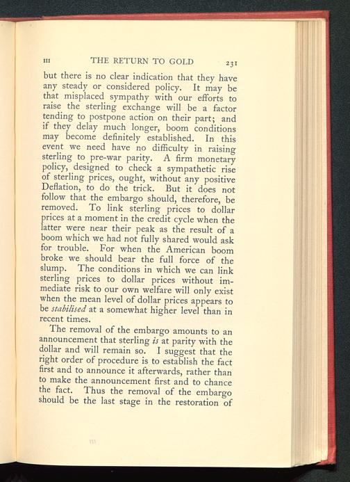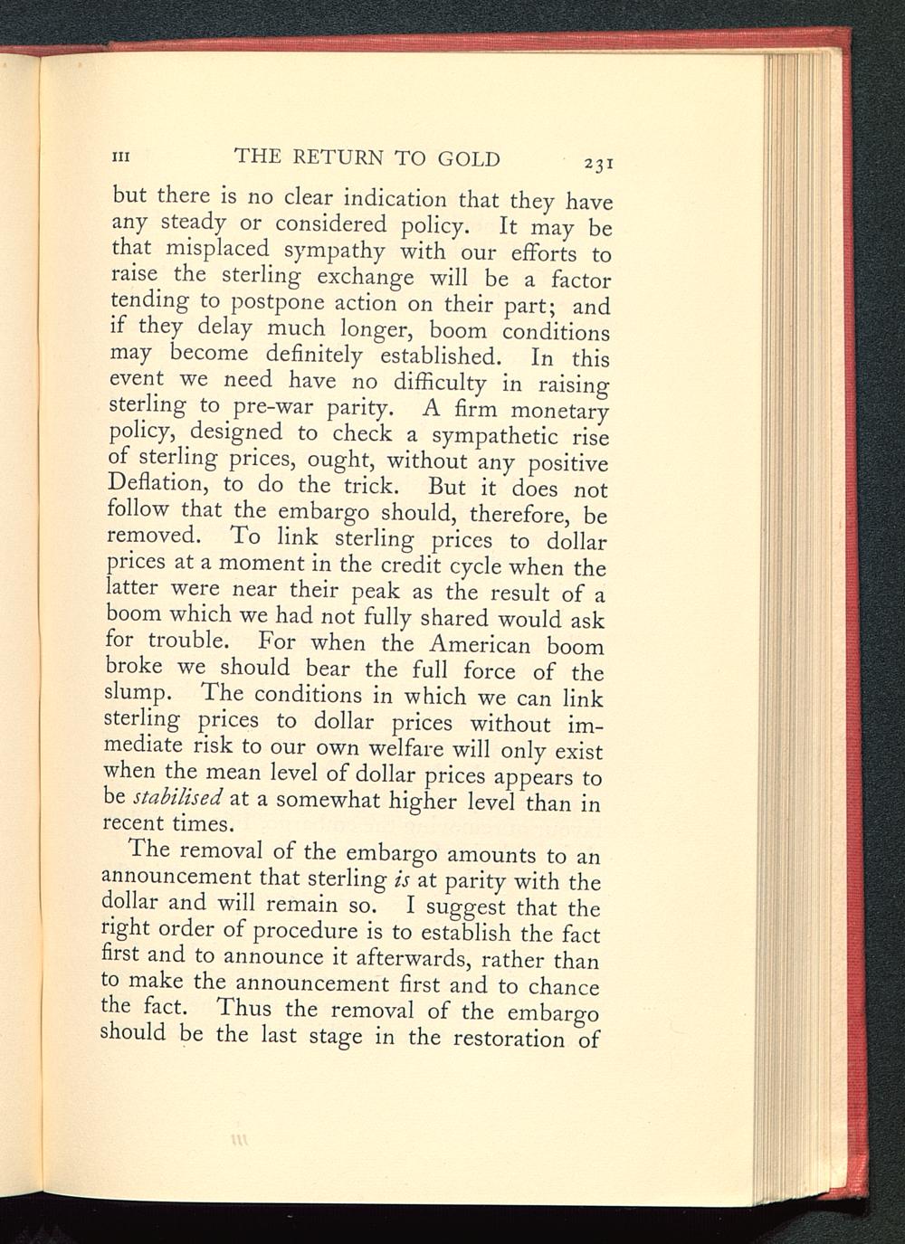 The removal of the embargo amounts to anannouncement that sterling is at parity with thedollar and will remain so. I suggest that theright order of procedure is to establish the factfirst and to announce it afterwards, rather thanto make the announcement first and to chancethe fact. Thus the removal of the embargoshould be the last stage in the restoration of