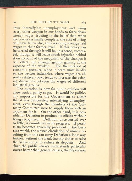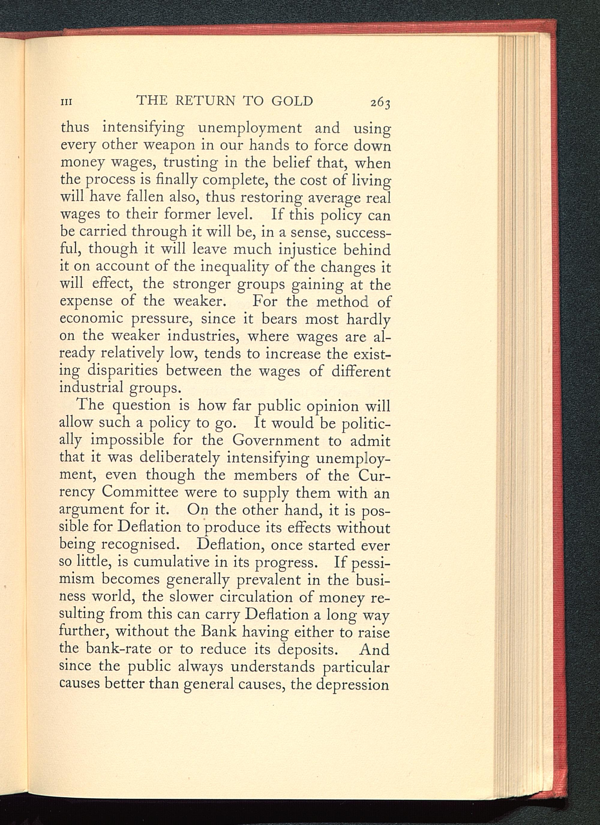 thus intensifying unemployment and usingevery other weapon in our hands to force downmoney wages, trusting in the belief that, whenthe process is finally complete, the cost of livingwill have fallen also, thus restoring average realwages to their former level. If this policy canbe carried through it will be, in a sense, success-ful, though it will leave much injustice behindit on account of the inequality of the changes itwill effect, the stronger groups gaining at theexpense of the weaker. For the method ofeconomic pressure, since it bears most hardlyon the weaker industries, where wages are al-ready relatively low, tends to increase the exist-ing disparities between the wages of differentindustrial groups.