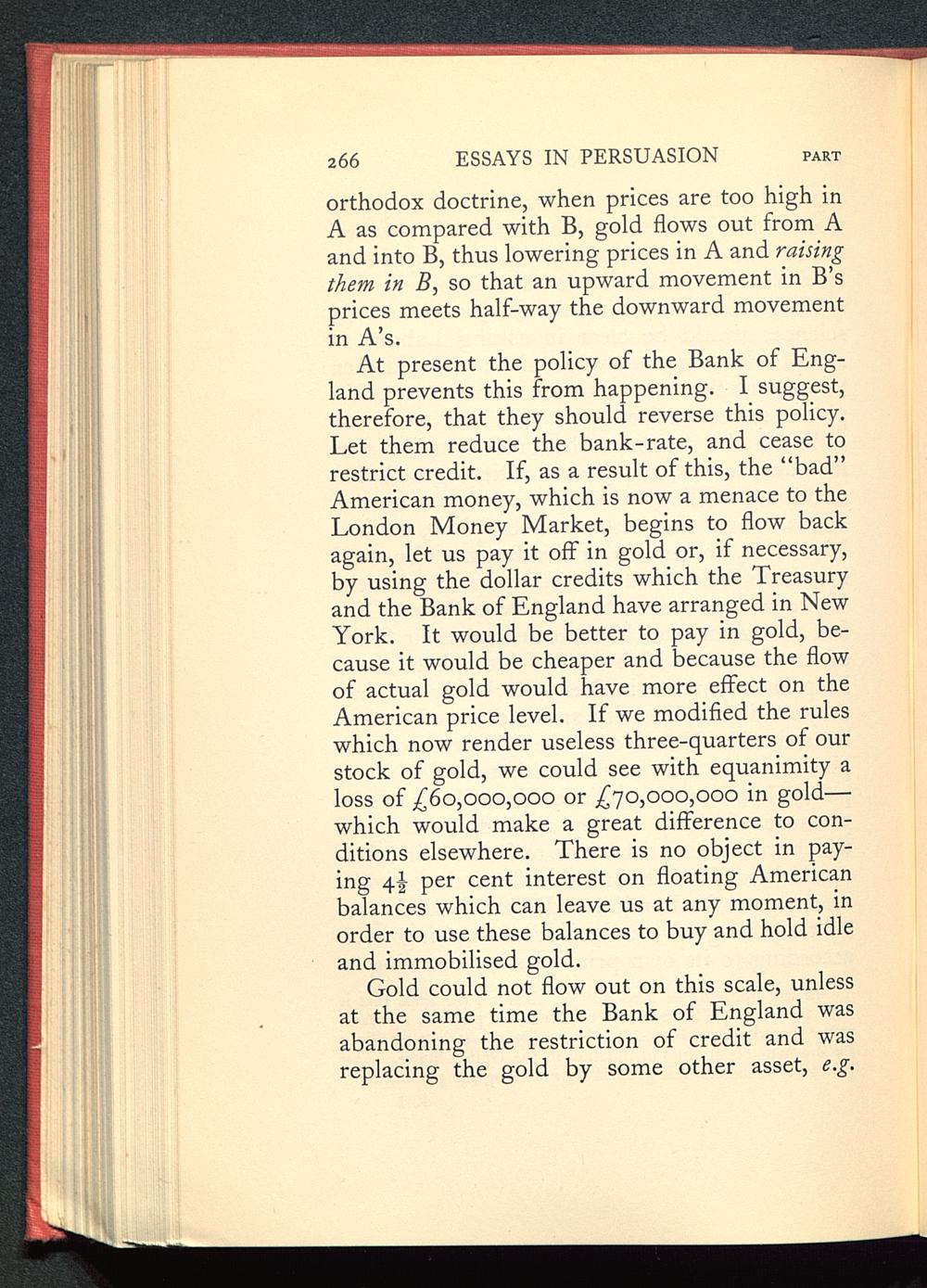At present the policy of the Bank of Eng-land prevents this from happening. I suggest,therefore, that they should reverse this policy.Let them reduce the bank-rate, and cease torestrict credit. If, as a result of this, the “bad”American money, which is now a menace to theLondon Money Market, begins to flow backagain, let us pay it off in gold or, if necessary,by using the dollar credits which the Treasuryand the Bank of England have arranged in NewYork. It would be better to pay in gold, be-cause it would be cheaper and because the flowof actual gold would have more effect on theAmerican price level. If we modified the ruleswhich now render useless three-quarters of ourstock of gold, we could see with equanimity aloss of £ 60,000,000 or £70,000 ,000 in gold—which would make a great difference to con-ditions elsewhere. There is no object in pay-ing 4J per cent interest on floating Americanbalances which can leave us at any moment, inorder to use these balances to buy and hold idleand immobilised gold.