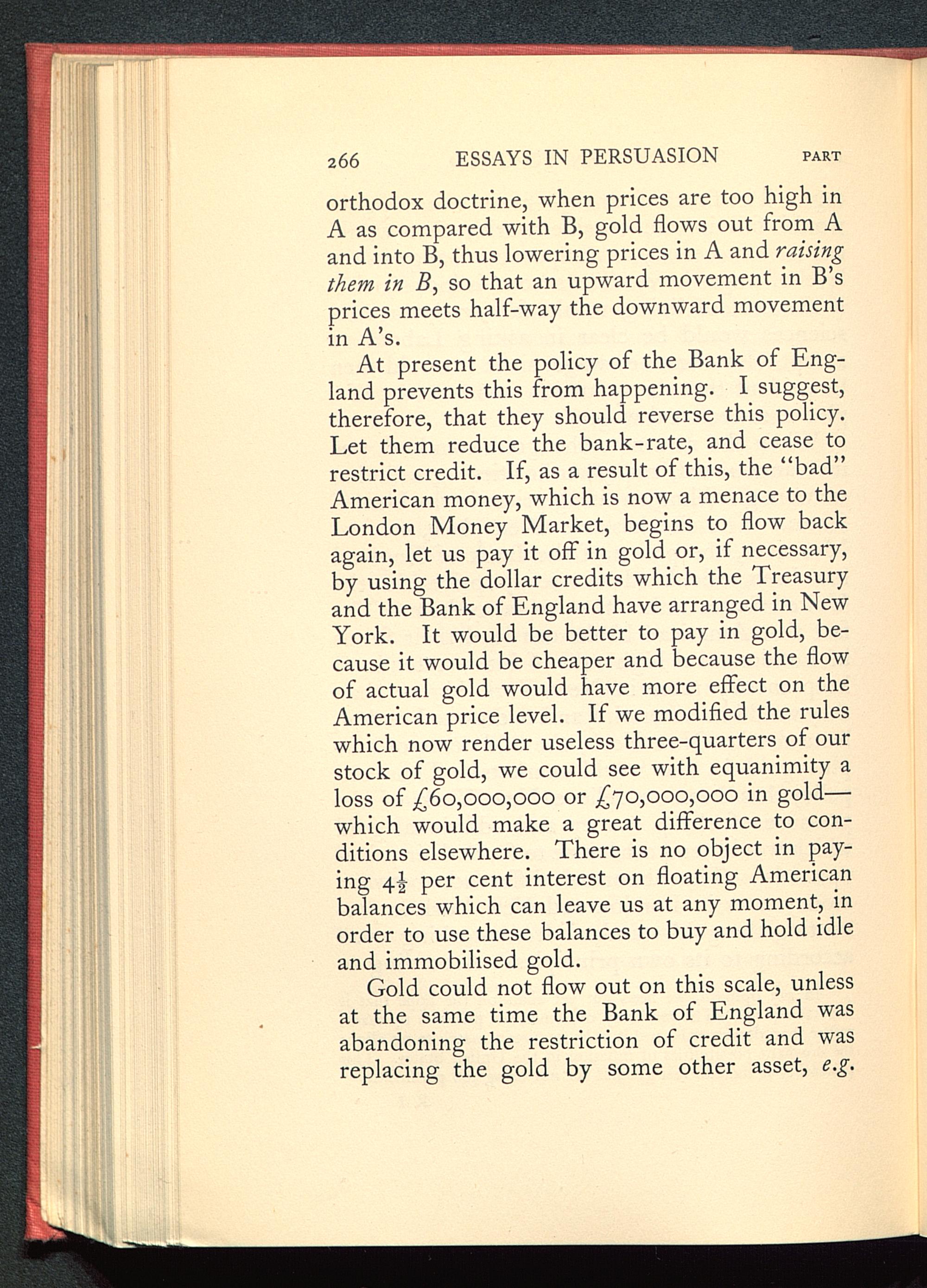 orthodox doctrine, when prices are too high inA as compared with B, gold flows out from Aand into B, thus lowering prices in A and raisingthem in B, so that an upward movement in B’sprices meets half-way the downward movementin A’s.