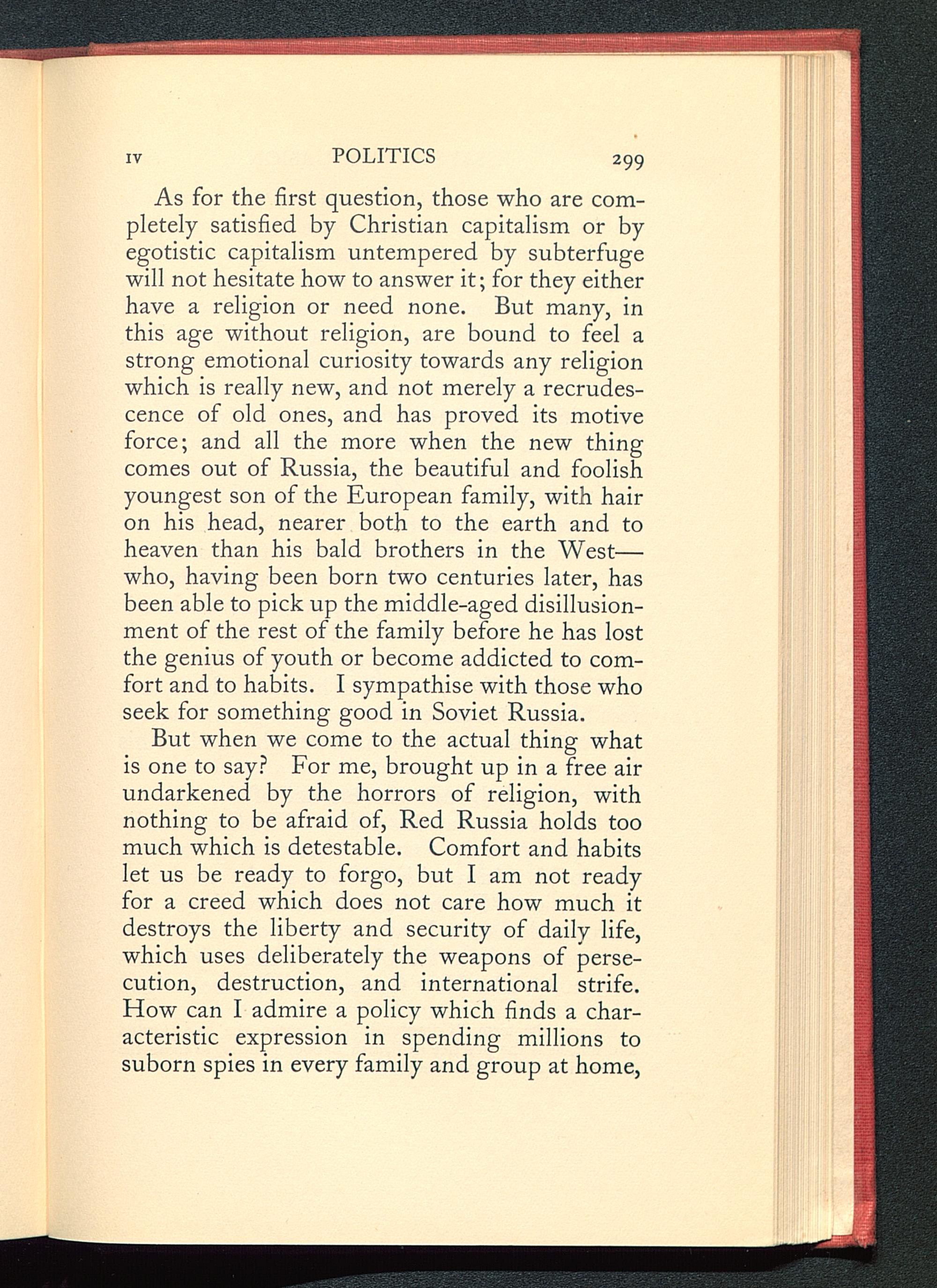 As for the first question, those who are com-pletely satisfied by Christian capitalism or byegotistic capitalism untempered by subterfugewill not hesitate how to answer it; for they eitherhave a religion or need none. But many, inthis age without religion, are bound to feel astrong emotional curiosity towards any religionwhich is really new, and not merely a recrudes-cence of old ones, and has proved its motiveforce; and all the more when the new thingcomes out of Russia , the beautiful and foolishyoungest son of the European family, with hairon his head, nearer both to the earth and toheaven than his bald brothers in the West—who, having been born two centuries later, hasbeen able to pick up the middle-aged disillusion-ment of the rest of the family before he has lostthe genius of youth or become addicted to com-fort and to habits. I sympathise with those whoseek for something good in Soviet Russia .