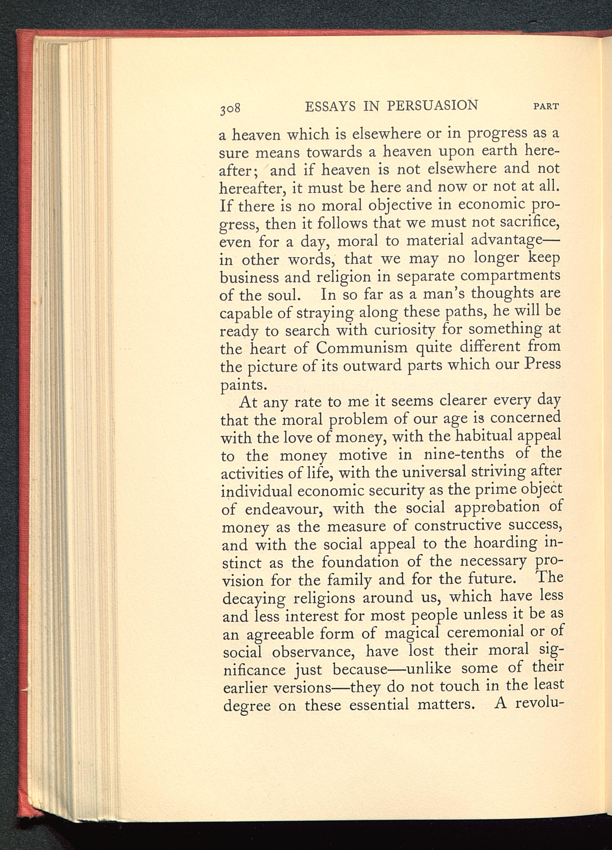 At any rate to me it seems clearer every daythat the moral problem of our age i3 concernedwith the love of money, with the habitual appealto the money motive in nine-tenths of theactivities of life, with the universal striving afterindividual economic security as the prime objectof endeavour, with the social approbation ofmoney as the measure of constructive success,and with the social appeal to the hoarding in-stinct as the foundation of the necessary pro-vision for the family and for the future. Thedecaying religions around us, which have lessand less interest for most people unless it be asan agreeable form of magical ceremonial or ofsocial observance, have lost their moral sig-nificance just because—unlike some of theirearlier versions—they do not touch in the leastdegree on these essential matters. A revolu-