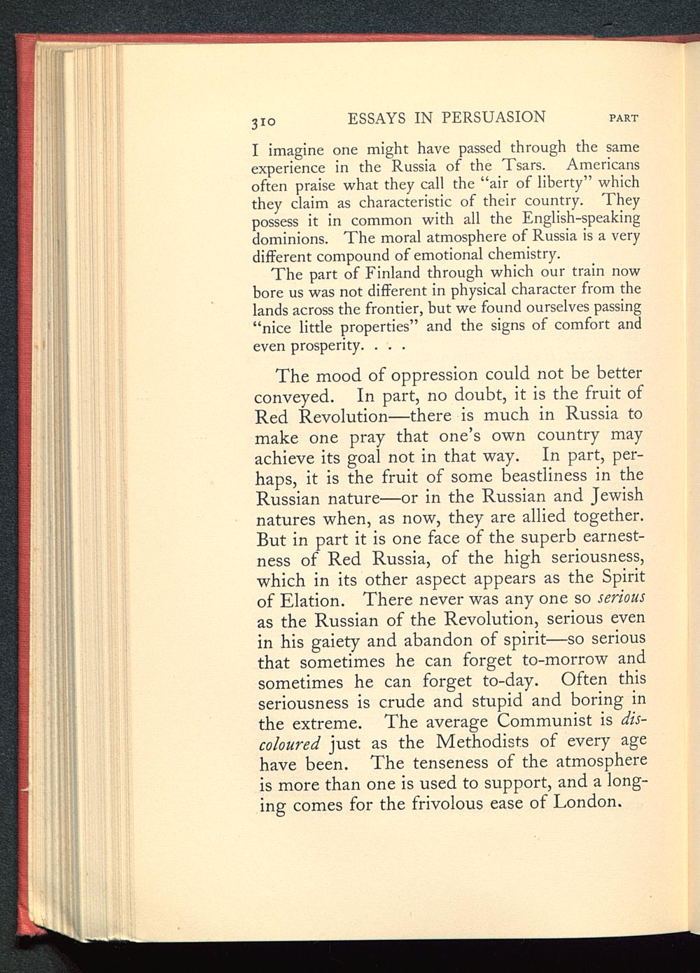 I imagine one might have passed through the sameexperience in the Russia of the Tsars. Americans often praise what they call the “air of liberty” whichthey claim as characteristic of their country. Theypossess it in common with all the English -speakingdominions. The moral atmosphere of Russia is a verydifferent compound of emotional chemistry.