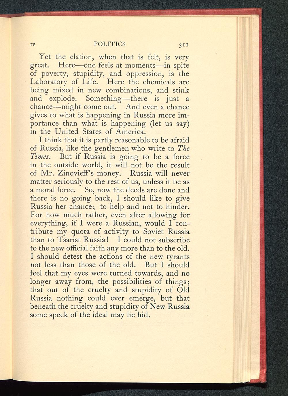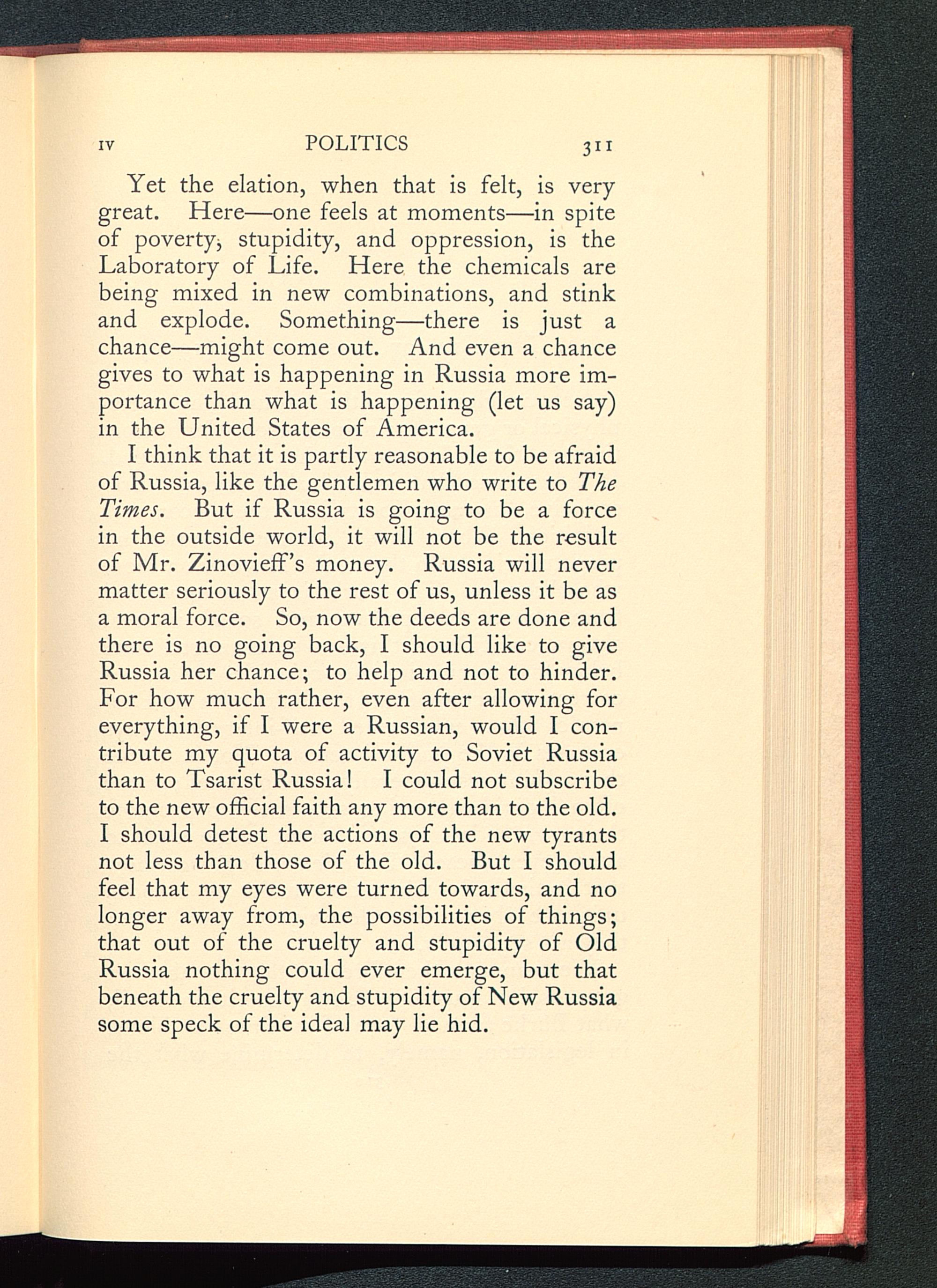 Yet the elation, when that is felt, is verygreat. Here—one feels at moments—in spiteof povertyj stupidity, and oppression, is theLaboratory of Life. Here the chemicals arebeing mixed in new combinations, and stinkand explode. Something—there is just achance—might come out. And even a chancegives to what is happening in Russia more im-portance than what is happening (let us say)in the United States of America .