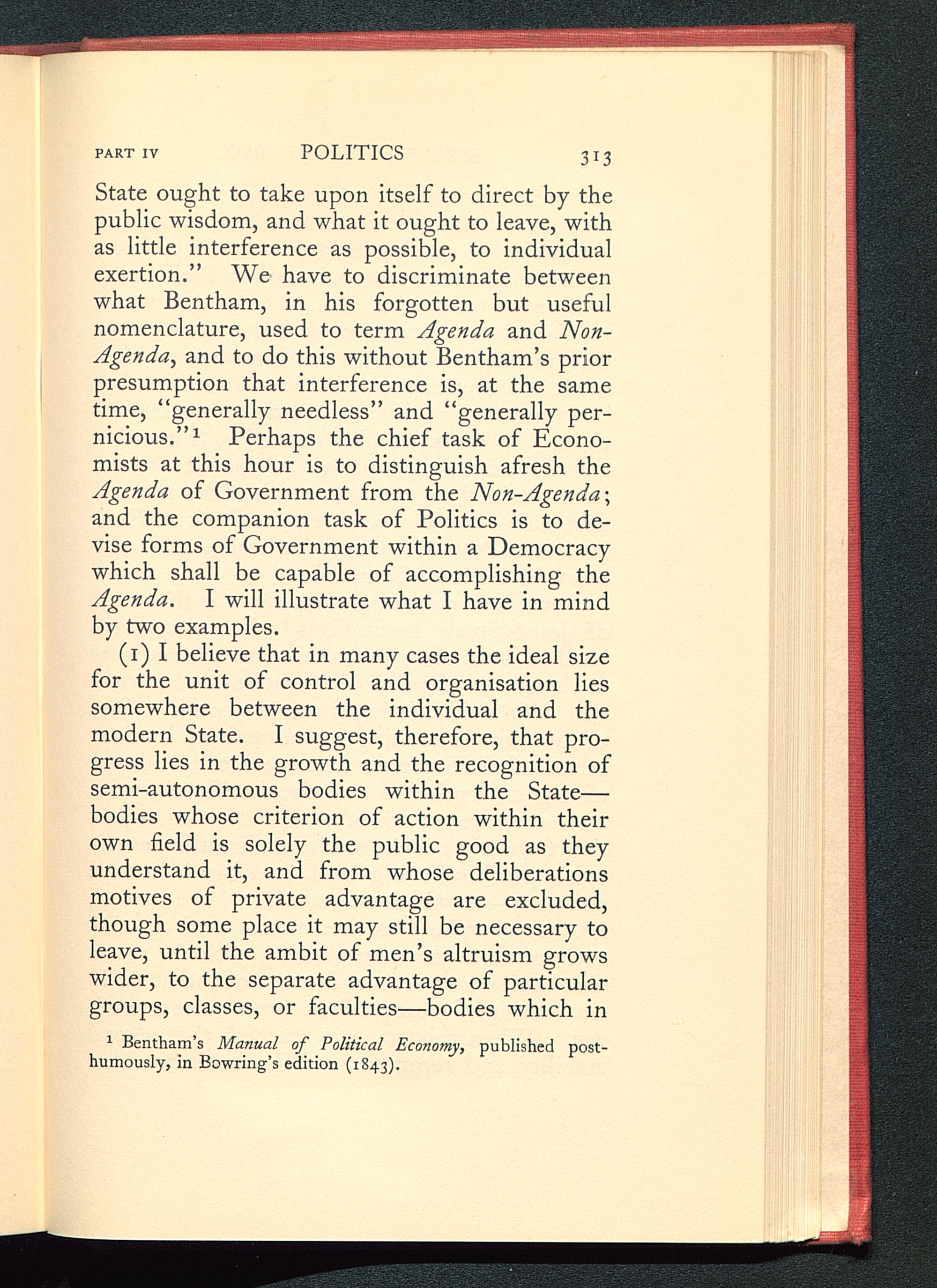 (1) I believe that in many cases the ideal sizefor the unit of control and organisation liessomewhere between the individual and themodern State. I suggest, therefore, that pro-gress lies in the growth and the recognition ofsemi-autonomous bodies within the State—bodies whose criterion of action within theirown field is solely the public good as theyunderstand it, and from whose deliberationsmotives of private advantage are excluded,though some place it may still be necessary toleave, until the ambit of men’s altruism growswider, to the separate advantage of particulargroups, classes, or faculties—bodies which in