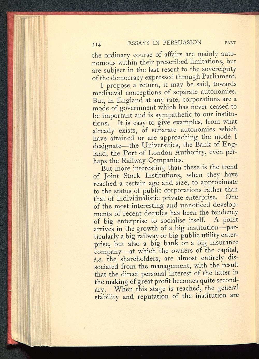 But more interesting than these is the trendof Joint Stock Institutions, when they havereached a certain age and size, to approximateto the status of public corporations rather thanthat of individualistic private enterprise. Oneof the most interesting and unnoticed develop-ments of recent decades has been the tendencyof big enterprise to socialise itself. A pointarrives in the growth of a big institution—par-ticularly a big railway or big public utility enter-prise, but also a big bank or a big insurancecompany—at which the owners of the capital,i.e. the shareholders, are almost entirely dis-sociated from the management, with the resultthat the direct personal interest of the latter inthe making of great profit becomes quite second-ary. When this stage is reached, the generalstability and reputation of the institution are