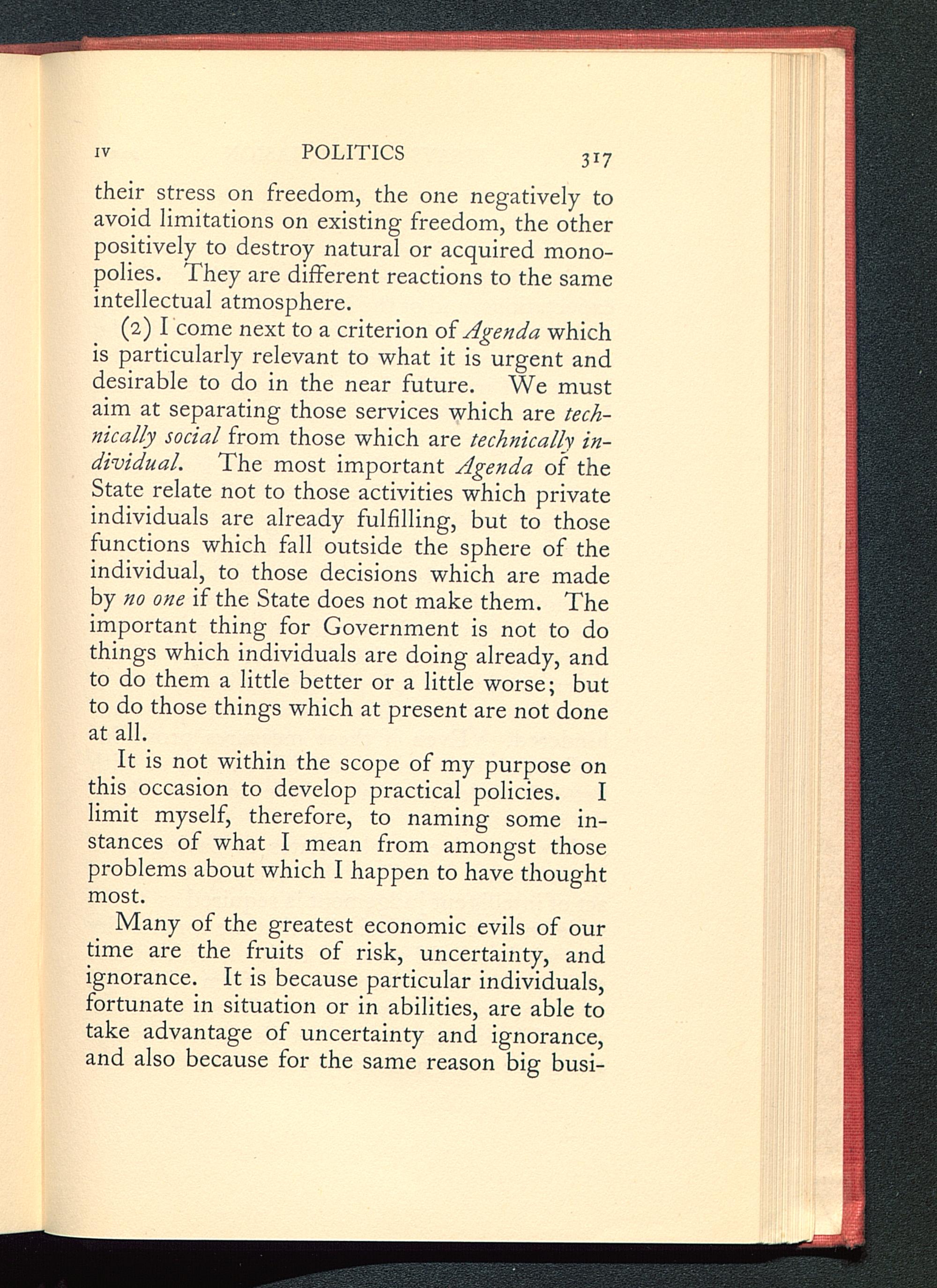 (2) I come next to a criterion of Agenda whichis particularly relevant to what it is urgent anddesirable to do in the near future. We mustaim at separating those services which are tech-nically social from those which are technically in-dividual. The most important Agenda of theState relate not to those activities which privateindividuals are already fulfilling, but to thosefunctions which fall outside the sphere of theindividual, to those decisions which are madeby no one if the State does not make them. Theimportant thing for Government is not to dothings which individuals are doing already, andto do them a little better or a little worse; butto do those things which at present are not doneat all.