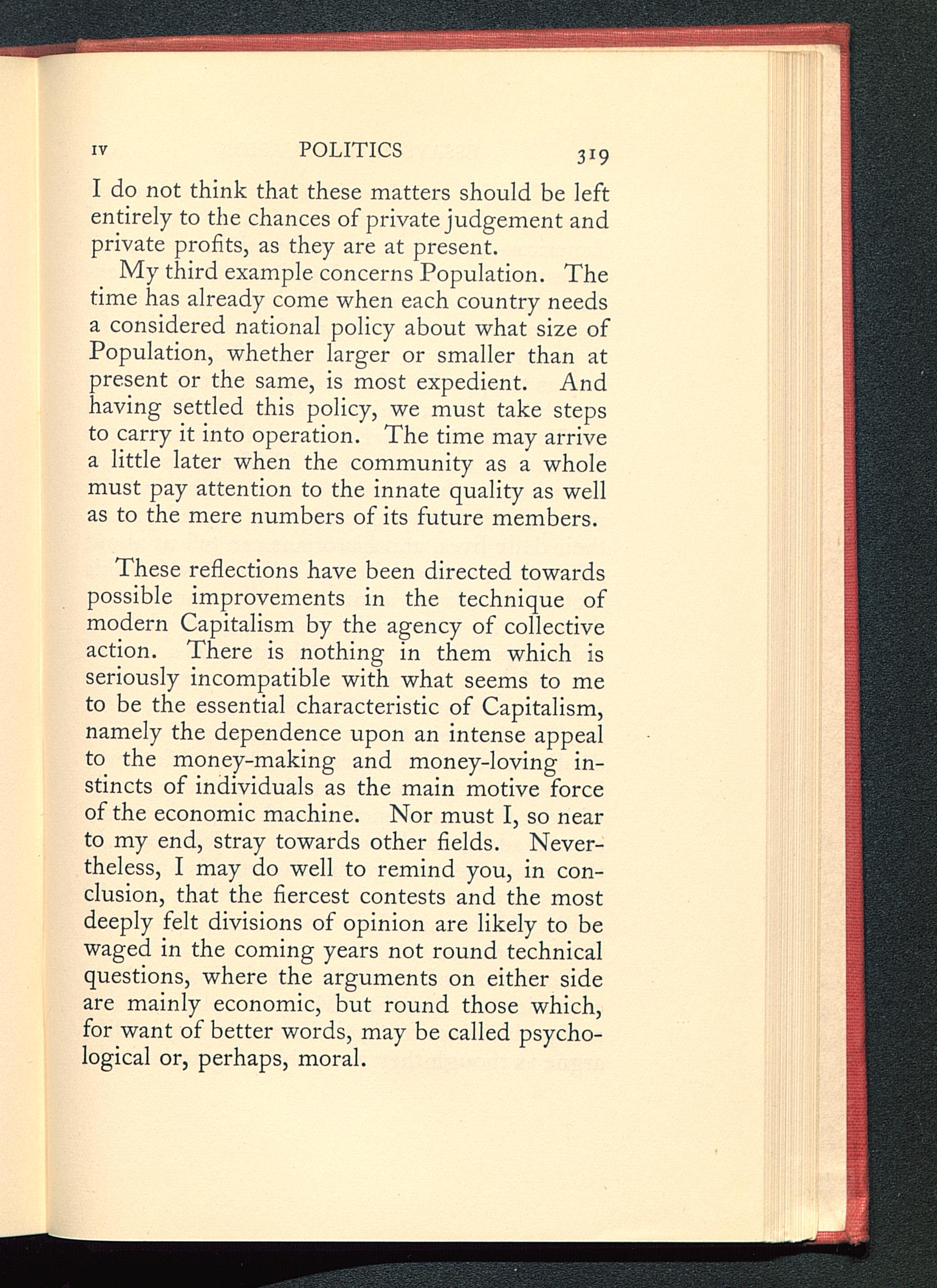 These reflections have been directed towardspossible improvements in the technique ofmodern Capitalism by the agency of collectiveaction. There is nothing in them which isseriously incompatible with what seems to meto be the essential characteristic of Capitalism ,namely the dependence upon an intense appealto the money-making and money-loving in-stincts of individuals as the main motive forceof the economic machine. Nor must I, so nearto my end, stray towards other fields. Never-theless, I may do well to remind you, in con-clusion, that the fiercest contests and the mostdeeply felt divisions of opinion are likely to bewaged in the coming years not round technicalquestions, where the arguments on either sideare mainly economic, but round those which,for want of better words, may be called psycho-logical or, perhaps, moral.
