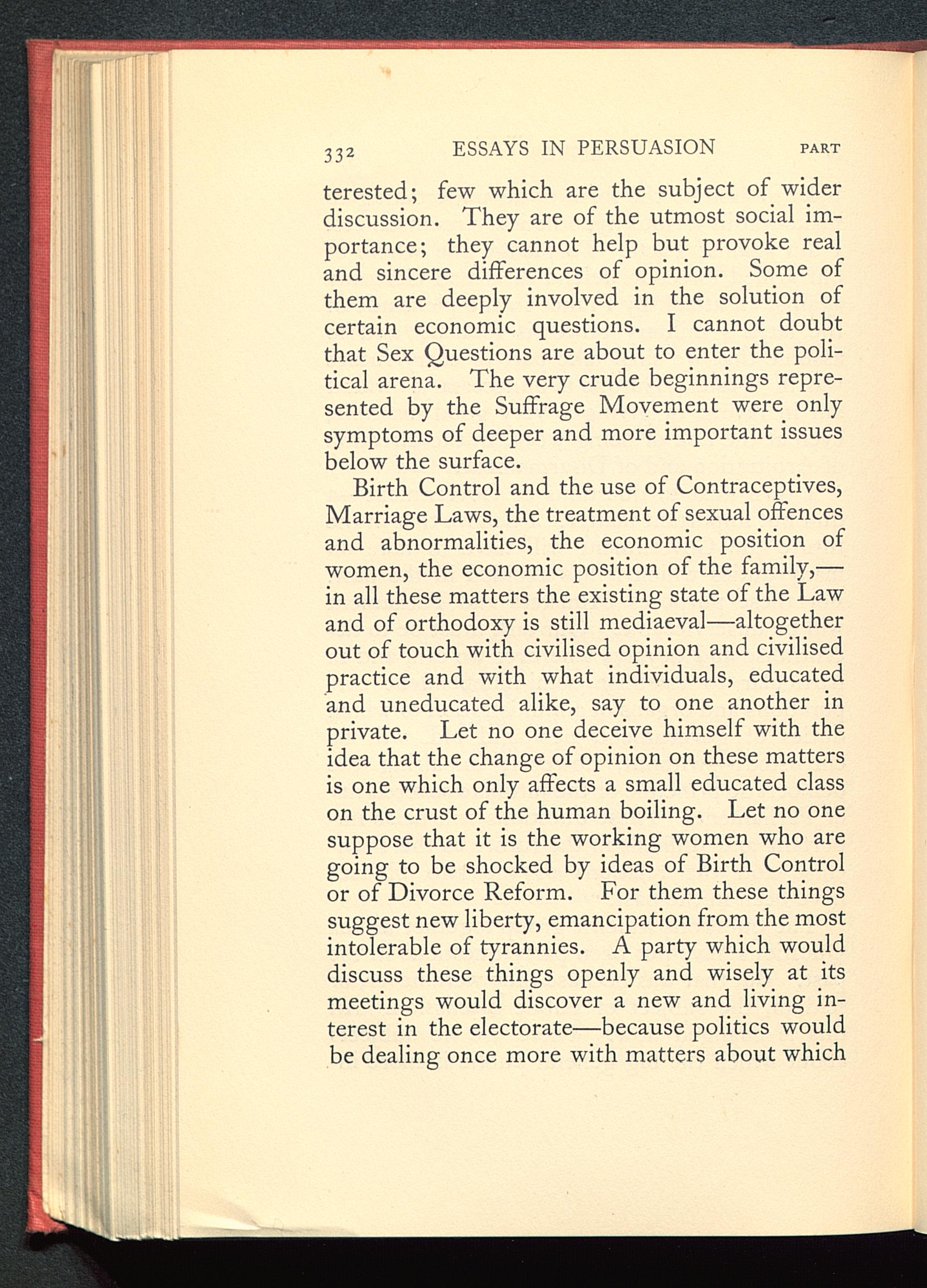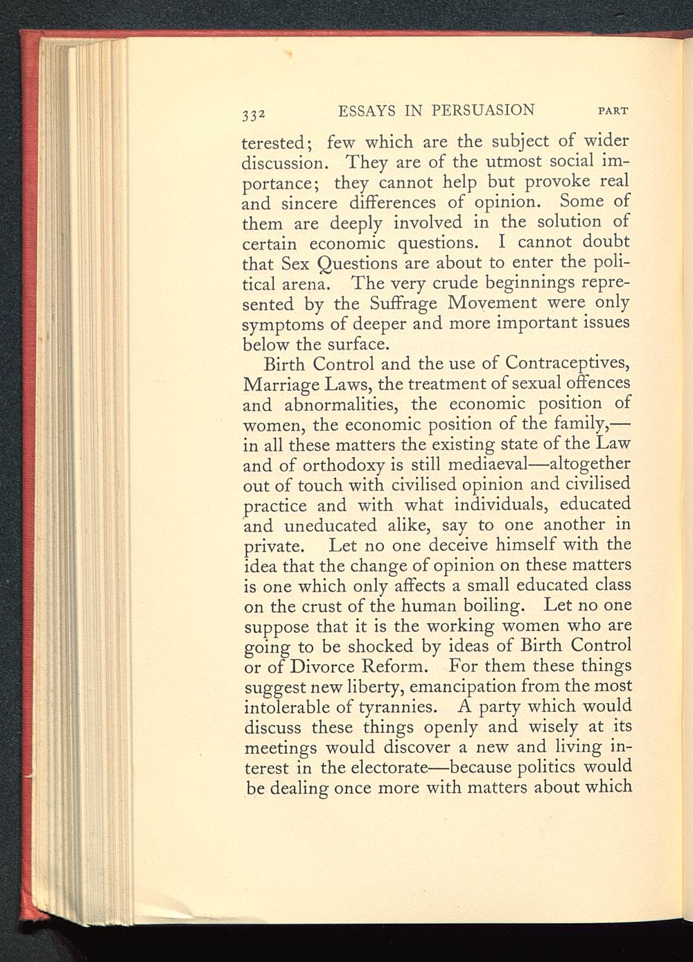 Birth Control and the use of Contraceptives ,Marriage Laws , the treatment of sexual offencesand abnormalities, the economic position ofwomen, the economic position of the family,—in all these matters the existing state of the Lawand of orthodoxy is still mediaeval—altogetherout of touch with civilised opinion and civilisedpractice and with what individuals, educatedand uneducated alike, say to one another inprivate. Let no one deceive himself with theidea that the change of opinion on these mattersis one which only affects a small educated classon the crust of the human boiling. Let no onesuppose that it is the working women who aregoing to be shocked by ideas of Birth Control or of Divorce Reform. For them these thingssuggest new liberty, emancipation from the mostintolerable of tyrannies. A party which woulddiscuss these things openly and wisely at itsmeetings would discover a new and living in-terest in the electorate—because politics wouldbe dealing once more with matters about which