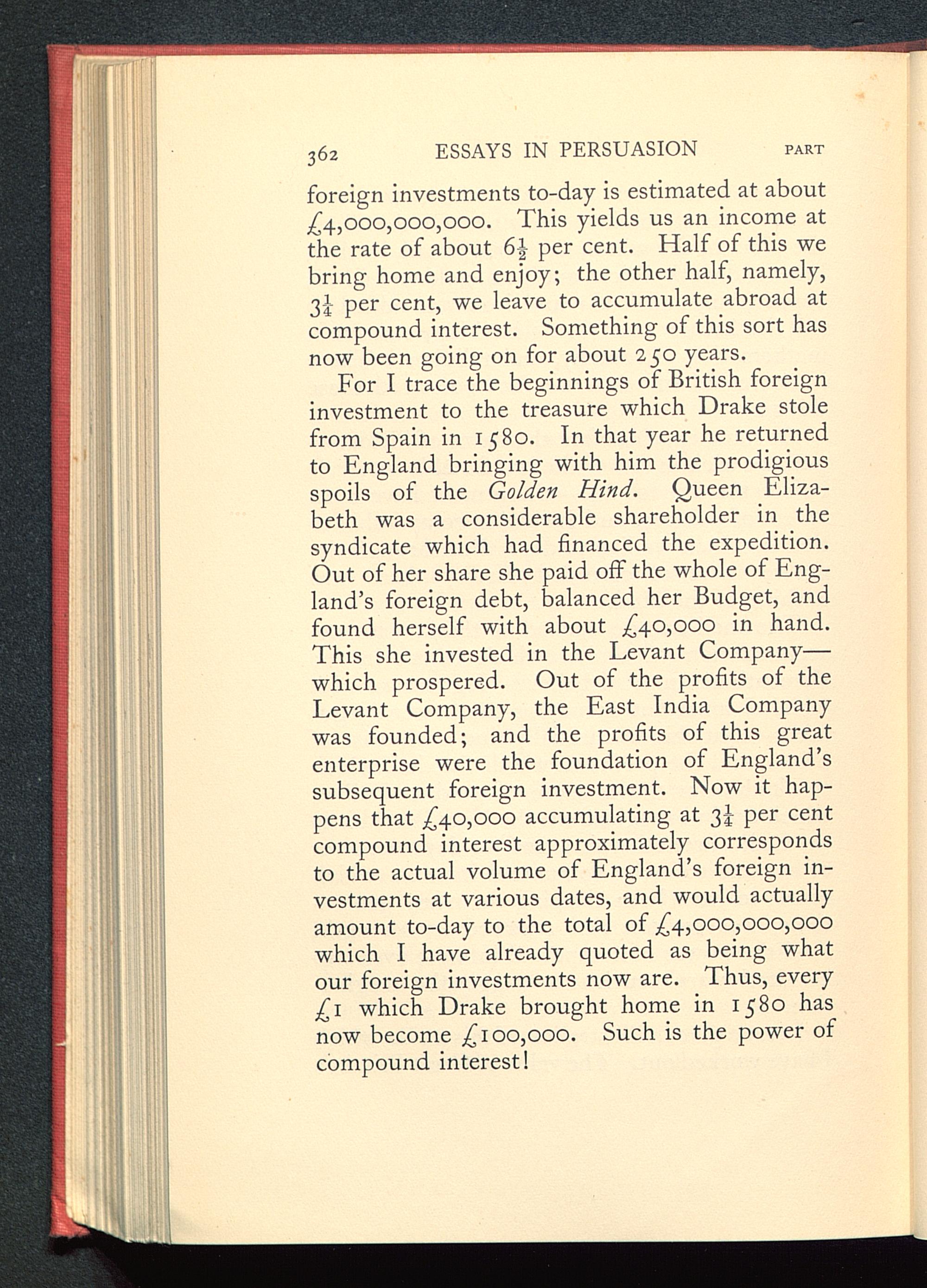 For I trace the beginnings of British foreigninvestment to the treasure which Drake stolefrom Spain in 1580. In that year he returnedto England bringing with him the prodigiousspoils of the Golden Hind. Queen Eliza-beth was a considerable shareholder in thesyndicate which had financed the expedition.Out of her share she paid off the whole of Eng-land’ s foreign debt, balanced her Budget, andfound herself with about £40,000 in hand.This she invested in the Levant Company—which prospered. Out of the profits of theLevant Company, the East India Company was founded; and the profits of this greatenterprise were the foundation of England’ssubsequent foreign investment. Now it hap-pens that £40,000 accumulating at 3I per centcompound interest approximately correspondsto the actual volume of England’s foreign in-vestments at various dates, and would actuallyamount to-day to the total of £4,000,000,000which I have already quoted as being whatour foreign investments now are. Thus, every£1 which Drake brought home in 1580 hasnow become £100,000. Such is the power ofcompound interest!