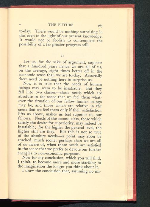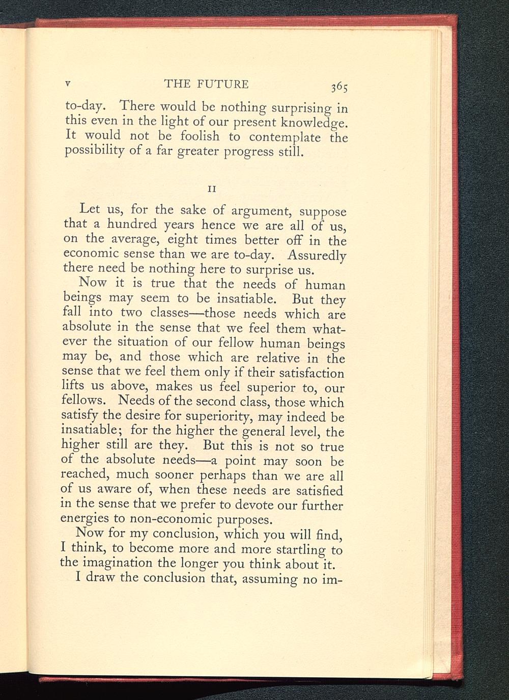 Now it is true that the needs of humanbeings may seem to be insatiable. But theyfall into two classes—those needs which areabsolute in the sense that we feel them what-ever the situation of our fellow human beingsmay be, and those which are relative in thesense that we feel them only if their satisfactionlifts us above, makes us feel superior to, ourfellows. Needs of the second class, those whichsatisfy the desire for superiority, may indeed beinsatiable; for the higher the general level, thehigher still are they. But this is not so trueof the absolute needs—a point may soon bereached, much sooner perhaps than we are allof us aware of, when these needs are satisfiedin the sense that we prefer to devote our furtherenergies to non-economic purposes.