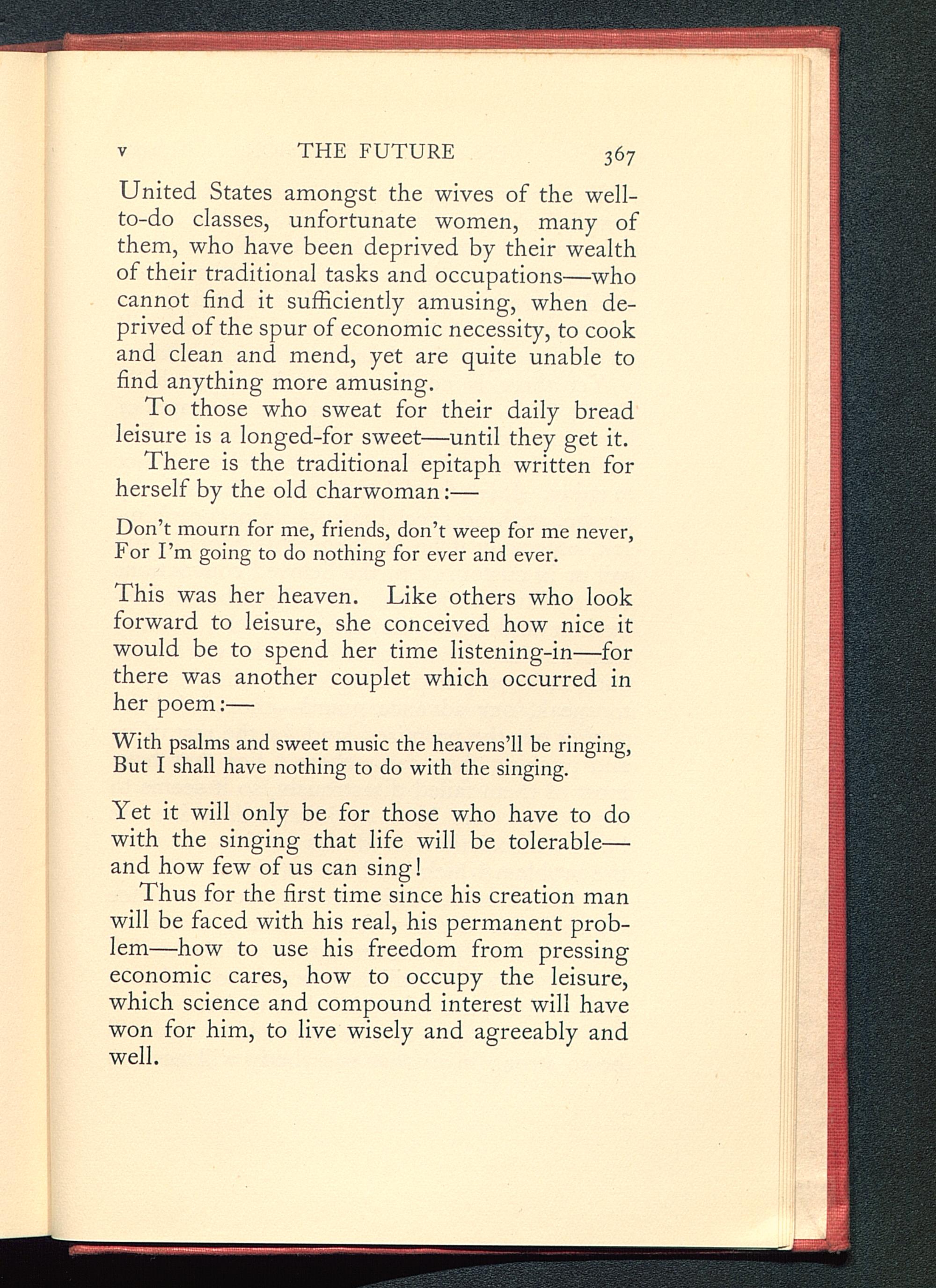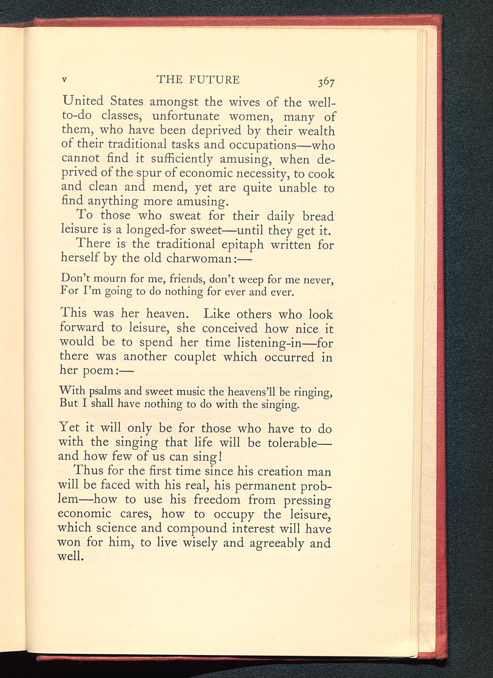 Thus for the first time since his creation manwill be faced with his real, his permanent prob-lem—how to use his freedom from pressingeconomic cares, how to occupy the leisure,which science and compound interest will havewon for him, to live wisely and agreeably andwell.