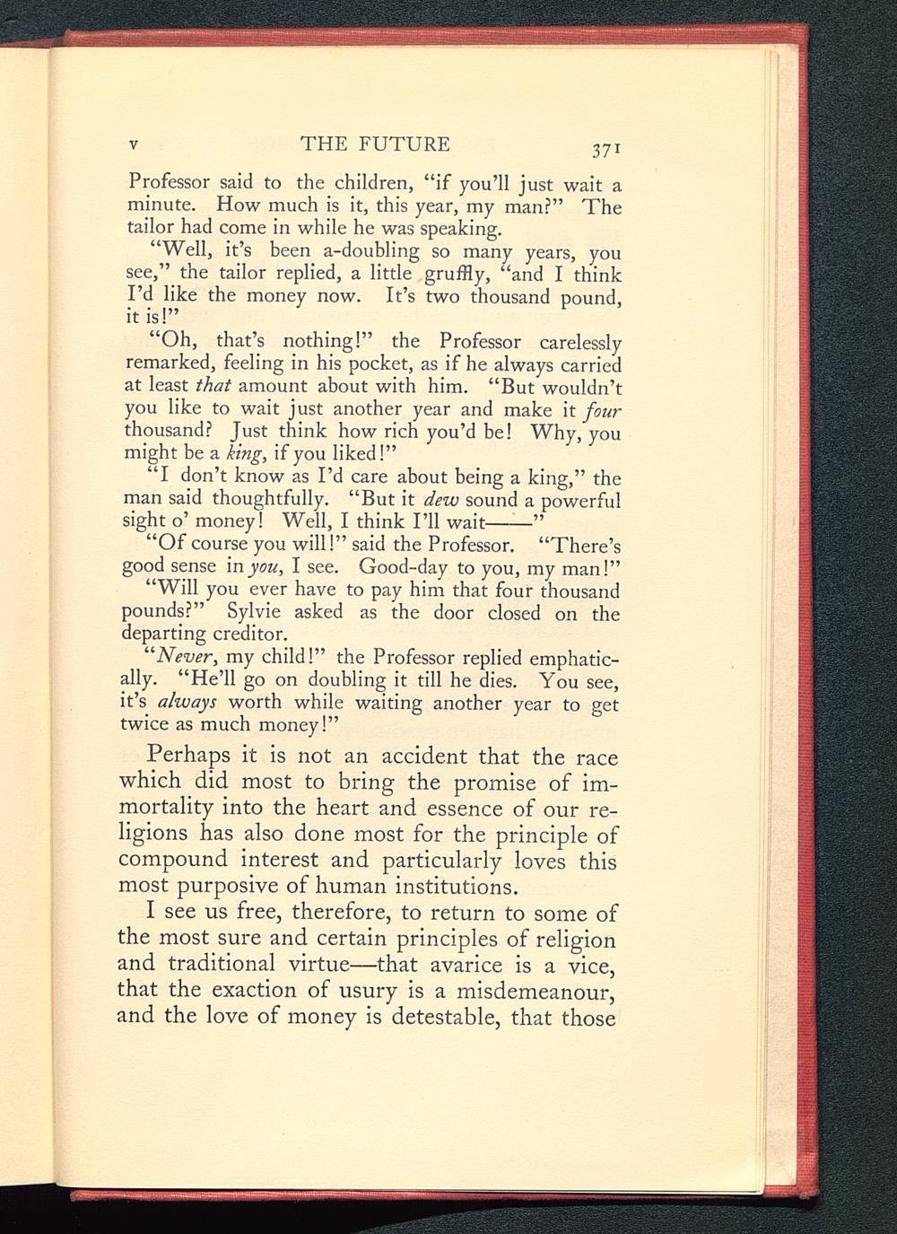 Perhaps it is not an accident that the racewhich did most to bring the promise of im-mortality into the heart and essence of our re-ligions has also done most for the principle ofcompound interest and particularly loves thismost purposive of human institutions.