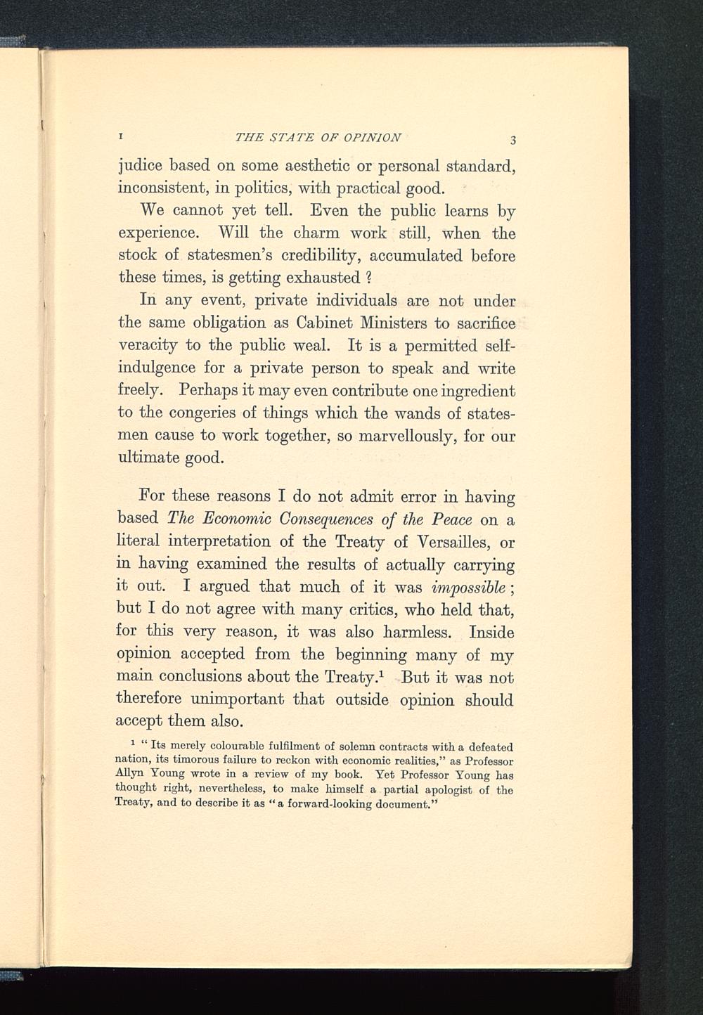 For these reasons I do not admit error in havingbased The Economic Consequences of the Peace on aliteral interpretation of the Treaty of Versailles , orin having examined the results of actually carryingit out. I argued that much of it was impossible ;but I do not agree with many critics, who held that,for this very reason, it was also harmless. Insideopinion accepted from the beginning many of mymain conclusions about the Treaty . 1 But it was nottherefore unimportant that outside opinion shouldaccept them also.