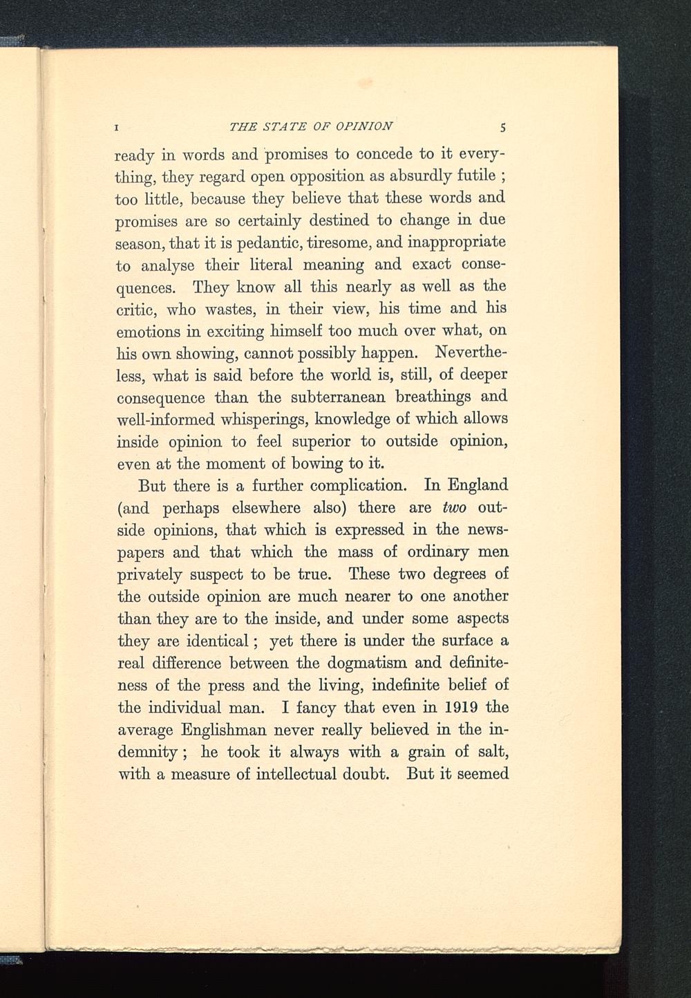 But there is a further complication. In England(and perhaps elsewhere also) there are two out-side opinions, that which is expressed in the news-papers and that which the mass of ordinary menprivately suspect to be true. These two degrees ofthe outside opinion are much nearer to one anotherthan they are to the inside, and under some aspectsthey are identical; yet there is under the surface areal difference between the dogmatism and definite-ness of the press and the living, indefinite belief ofthe individual man. I fancy that even in 1919 theaverage Englishman never really believed in the in-demnity ; he took it always with a grain of salt,with a measure of intellectual doubt. But it seemed