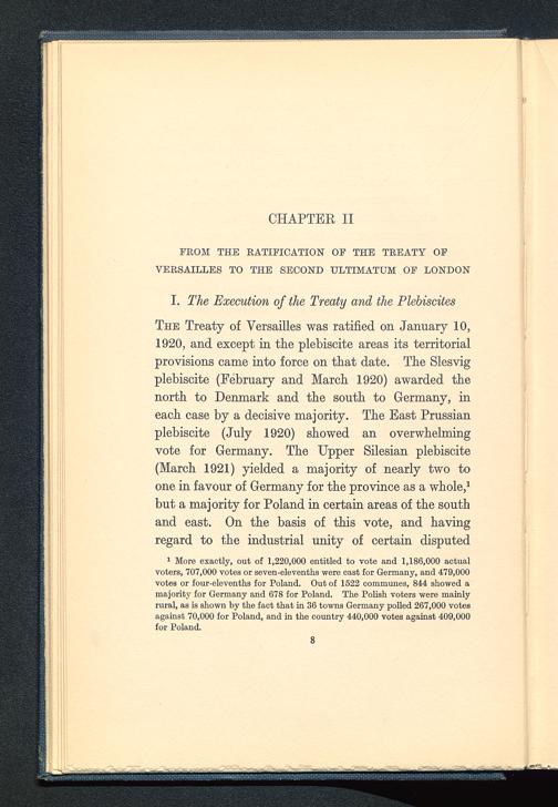 The Treaty of Versailles was ratified on January 10,1920, and except in the plebiscite areas its territorialprovisions came into force on that date. The Slesvig plebiscite (February and March 1920) awarded thenorth to Denmark and the south to Germany , ineach case by a decisive majority. The East Prussian plebiscite (July 1920) showed an overwhelmingvote for Germany. The Upper Silesian plebiscite(March 1921) yielded a majority of nearly two toone in favour of Germany for the province as a whole, 1but a majority for Poland in certain areas of the southand east. On the basis of this vote, and havingregard to the industrial unity of certain disputed