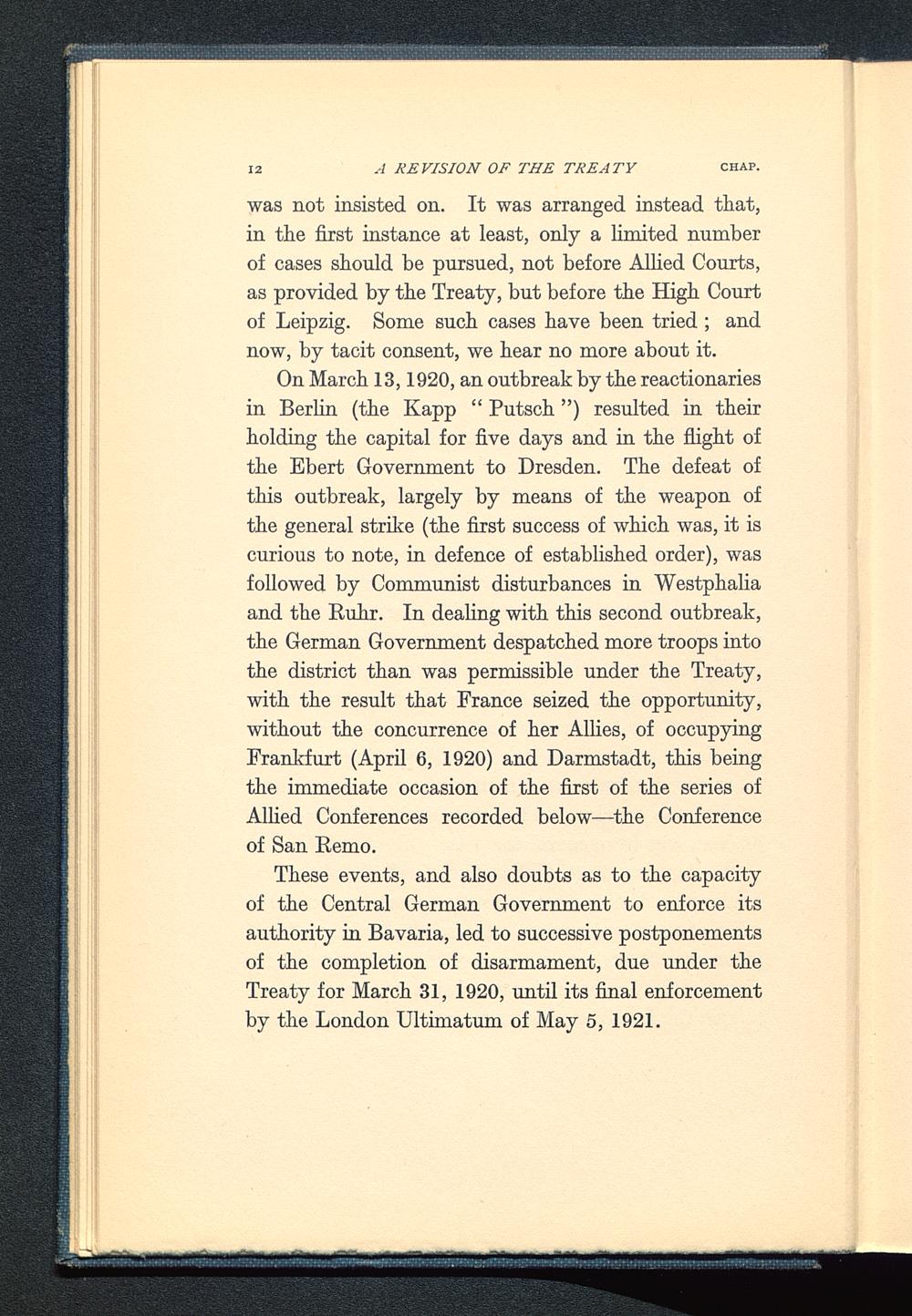 On March 13,1920, an outbreak by the reactionariesin Berlin (the Kapp " Putsch ") resulted in theirholding the capital for five days and in the flight ofthe Ebert Government to Dresden . The defeat ofthis outbreak, largely by means of the weapon ofthe general strike (the first success of which was, it iscurious to note, in defence of established order), wasfollowed by Communist disturbances in Westphaliaand the Euhr. In dealing with this second outbreak,the German Government despatched more troops intothe district than was permissible under the Treaty ,with the result that France seized the opportunity,without the concurrence of her Allies, of occupyingFrankfurt (April 6, 1920) and Darmstadt , this beingthe immediate occasion of the first of the series ofAllied Conferences recorded below—the Conferenceof San Remo.
