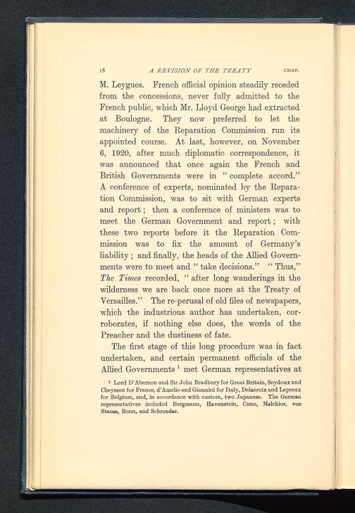 1 Lord D'Abernon and Sir John Bradbury for Great Britain, Seydoux andCheysson for France, d'Amelio and Giannini for Italy, Delacroix and Lepreux for Belgium, and, in accordance with custom, two Japanese. The German representatives included Bergmann, Havenstein, Cuno, Melchior, vonStauBS, Bonn, and Schroeder.