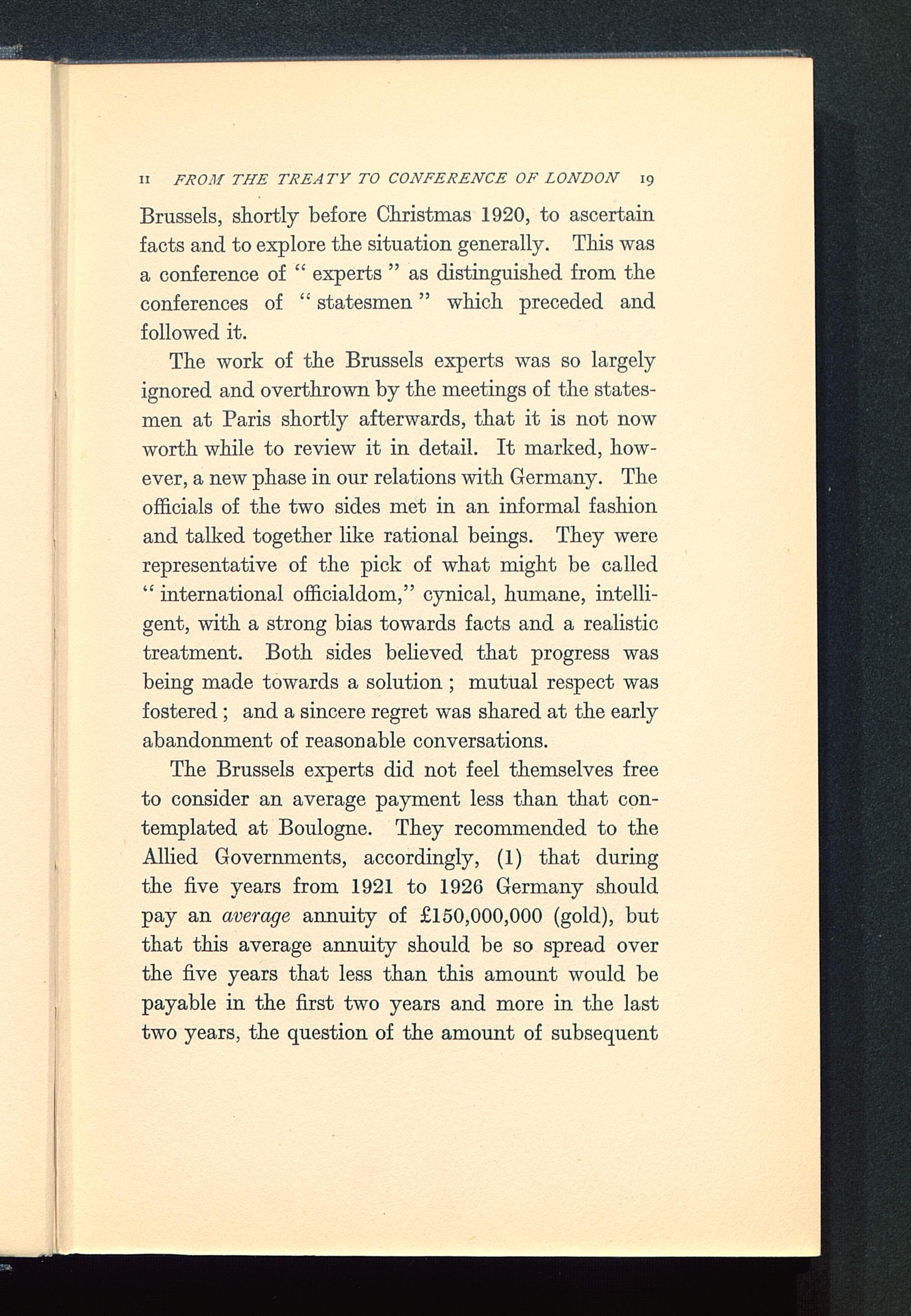 The work of the Brussels experts was so largelyignored and overthrown by the meetings of the states-men at Paris shortly afterwards, that it is not nowworth while to review it in detail. It marked, how-ever, a new phase in our relations with Germany . Theofficials of the two sides met in an informal fashionand talked together like rational beings. They wererepresentative of the pick of what might be called" international officialdom," cynical, humane, intelli-gent, with a strong bias towards facts and a realistictreatment. Both sides believed that progress wasbeing made towards a solution ; mutual respect wasfostered ; and a sincere regret was shared at the earlyabandonment of reasonable conversations.