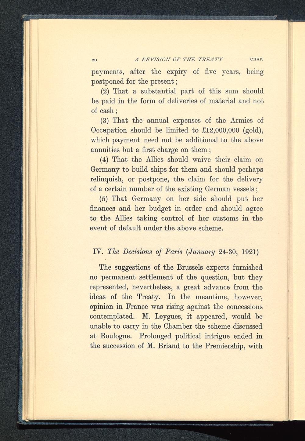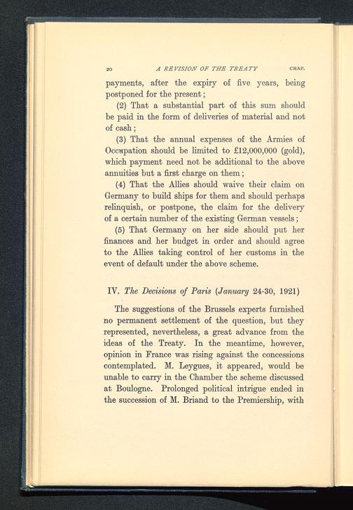 The suggestions of the Brussels experts furnishedno permanent settlement of the question, but theyrepresented, nevertheless, a great advance from theideas of the Treaty . In the meantime, however,opinion in France was rising against the concessionscontemplated. M. Leygues, it appeared, would beunable to carry in the Chamber the scheme discussedat Boulogne. Prolonged political intrigue ended inthe succession of M. Briand to the Premiership, with
