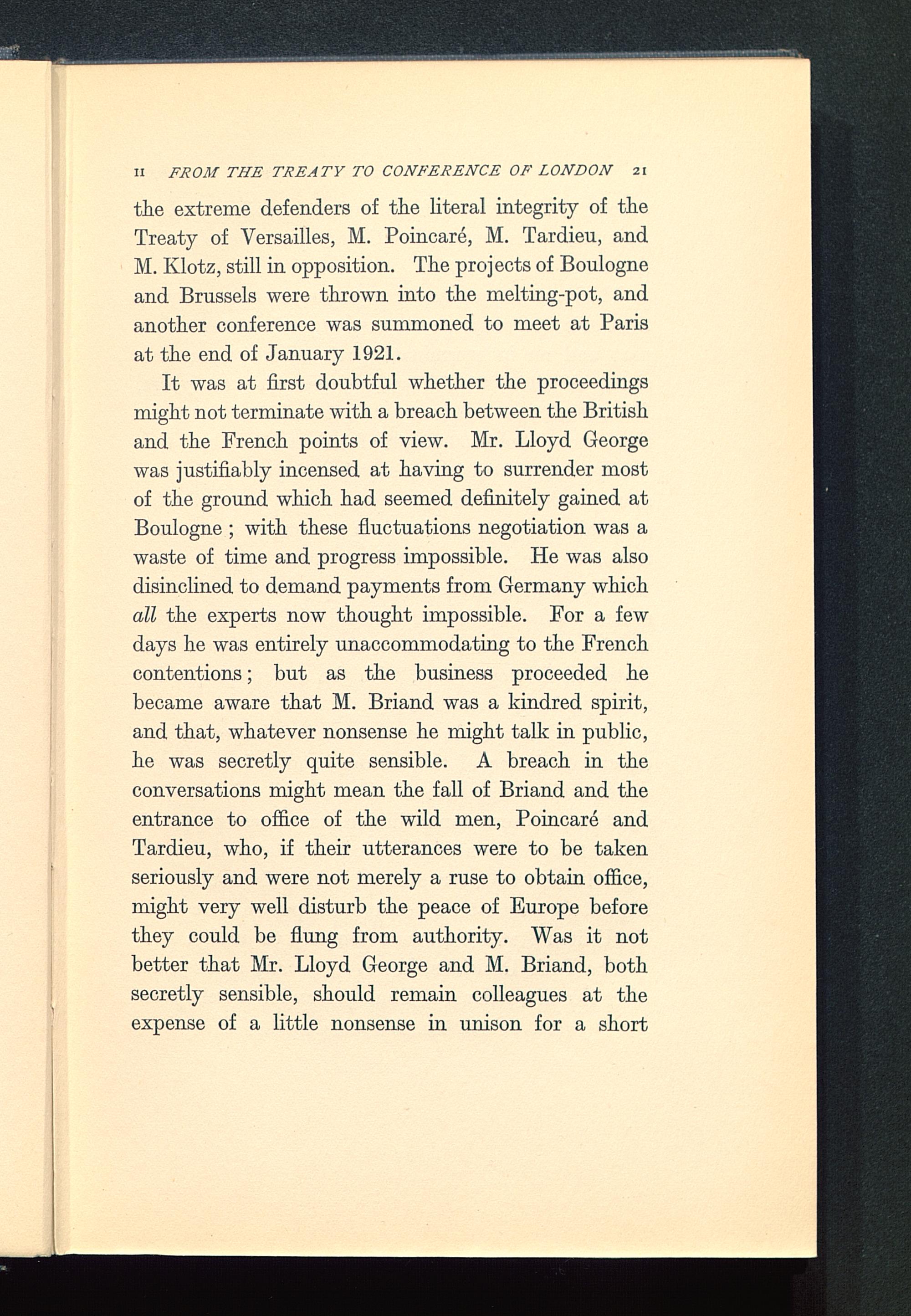 It was at first doubtful whether the proceedingsmight not terminate with a breach between the Britishand the French points of view. Mr. Lloyd George was justifiably incensed at having to surrender mostof the ground which had seemed definitely gained atBoulogne ; with these fluctuations negotiation was awaste of time and progress impossible. He was alsodisinclined to demand payments from Germany whichall the experts now thought impossible. For a fewdays he was entirely unaccommodating to the Frenchcontentions; but as the business proceeded hebecame aware that M. Briand was a kindred spirit,and that, whatever nonsense he might talk in public,he was secretly quite sensible. A breach in theconversations might mean the fall of Briand and theentrance to office of the wild men, Poincare andTardieu, who, if their utterances were to be takenseriously and were not merely a ruse to obtain office,might very well disturb the peace of Europe beforethey could be flung from authority. Was it notbetter that Mr. Lloyd George and M. Briand, bothsecretly sensible, should remain colleagues at theexpense of a little nonsense in unison for a short