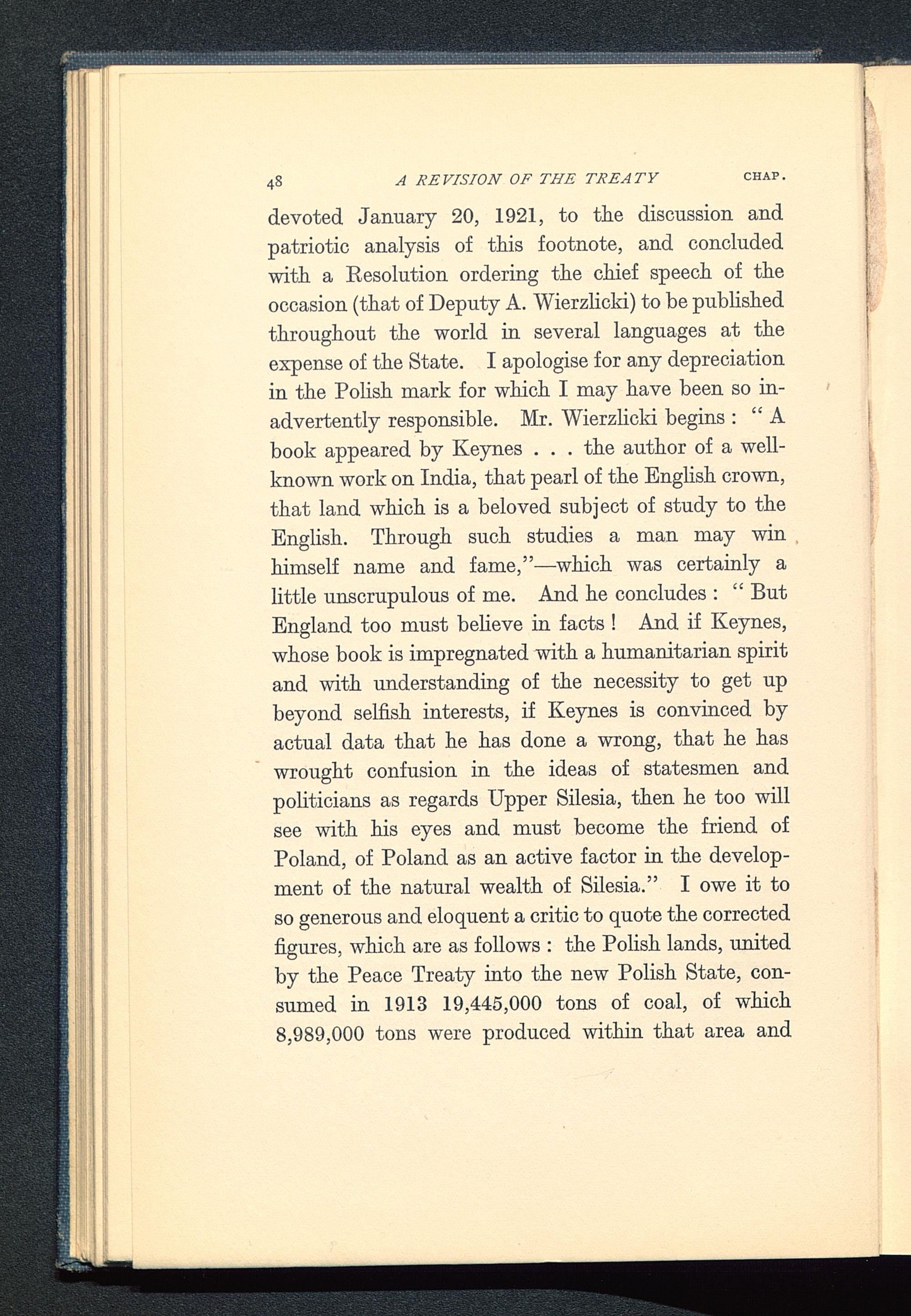 devoted January 20, 1921, to the discussion andpatriotic analysis of this footnote, and concludedwith a Kesolution ordering the chief speech of theoccasion (that of Deputy A. Wierzlicki) to be publishedthroughout the world in several languages at theexpense of the State. I apologise for any depreciationin the Polish mark for which I may have been so in-advertently responsible. Mr. Wierzlicki begins : " Abook appeared by Keynes . . . the author of a well-known work on India, that pearl of the English crown,that land which is a beloved subject of study to theEnglish . Through such studies a man may winhimself name and fame,"—which was certainly alittle unscrupulous of me. And he concludes : " ButEngland too must believe in facts ! And if Keynes ,whose book is impregnated with a humanitarian spiritand with understanding of the necessity to get upbeyond selfish interests, if Keynes is convinced byactual data that he has done a wrong, that he haswrought confusion in the ideas of statesmen andpoliticians as regards Upper Silesia , then he too willsee with his eyes and must become the friend ofPoland, of Poland as an active factor in the develop-ment of the natural wealth of Silesia ." I owe it toso generous and eloquent a critic to quote the correctedfigures, which are as follows : the Polish lands, unitedby the Peace Treaty into the new Polish State, con-sumed in 1913 19,445,000 tons of coal, of which8,989,000 tons were produced within that area and