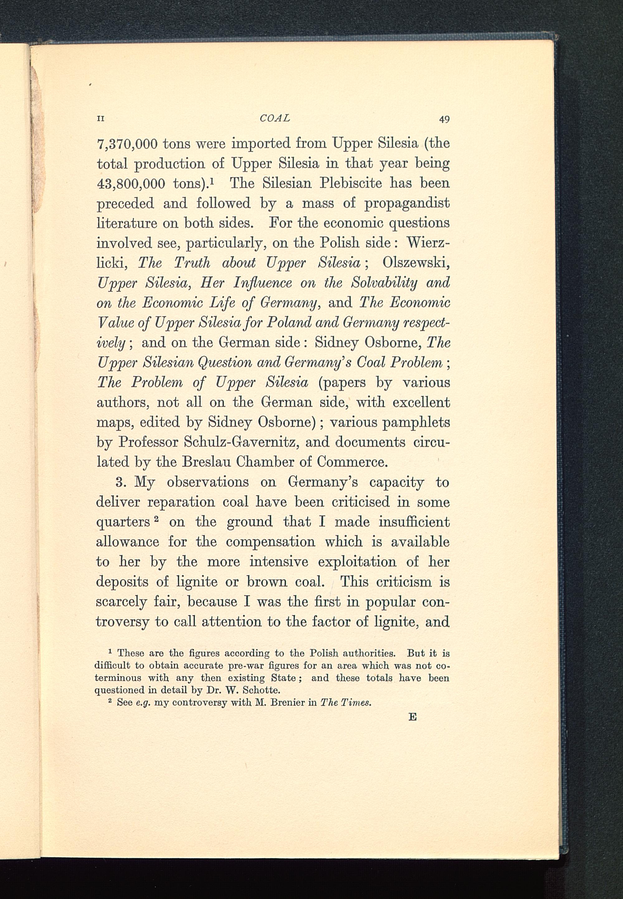 3. My observations on Germany' s capacity todeliver reparation coal have been criticised in somequarters 2 on the ground that I made insufficientallowance for the compensation which is availableto her by the more intensive exploitation of herdeposits of lignite or brown coal. This criticism isscarcely fair, because I was the first in popular con-troversy to call attention to the factor of lignite, and