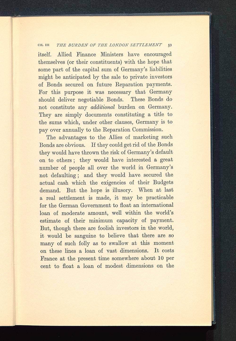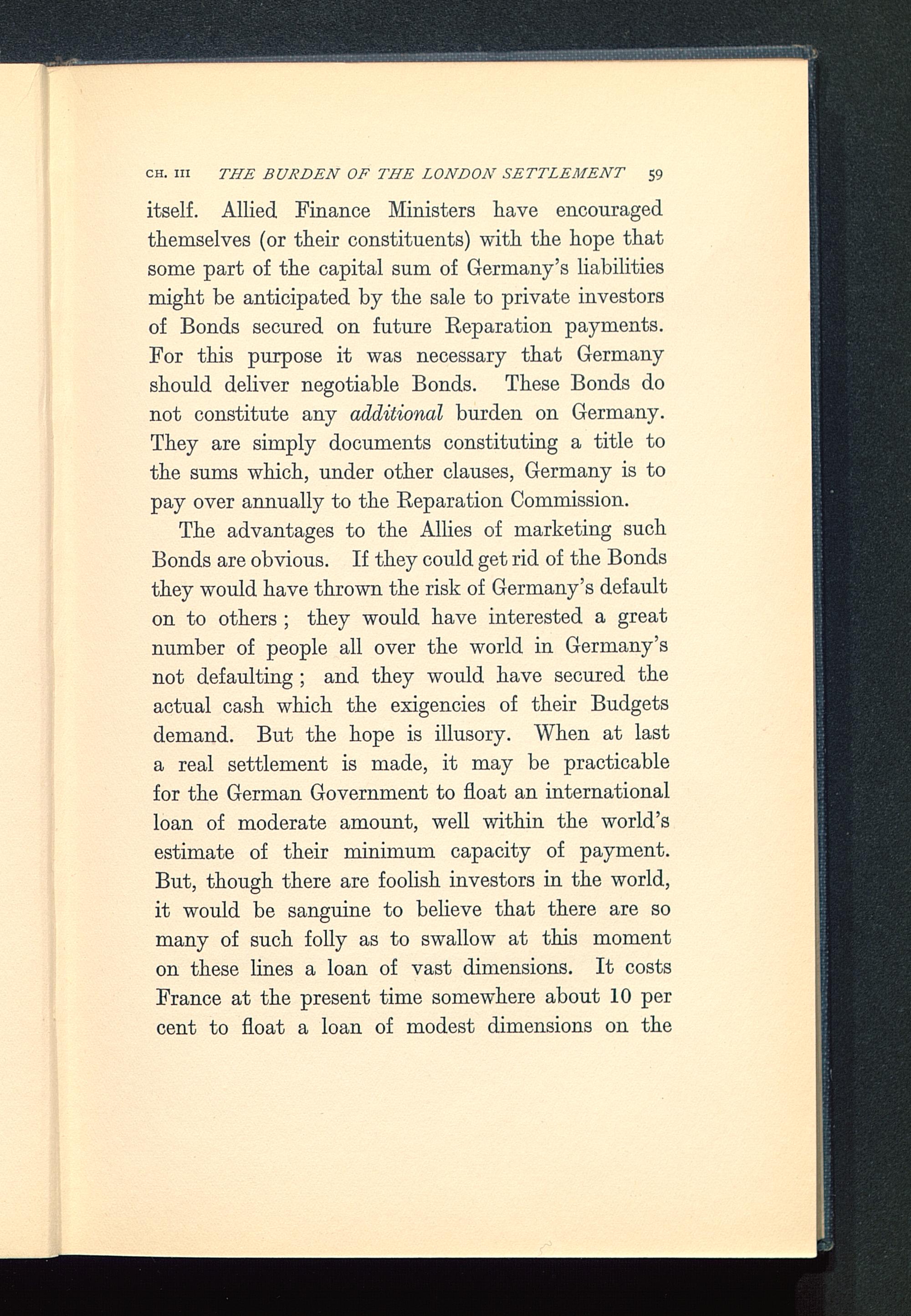 itself. Allied Finance Ministers have encouragedthemselves (or their constituents) with the hope thatsome part of the capital sum of Germany 's liabilitiesmight be anticipated by the sale to private investorsof Bonds secured on future Separation payments.For this purpose it was necessary that Germany should deliver negotiable Bonds . These Bonds donot constitute any additional burden on Germany .They are simply documents constituting a title tothe sums which, under other clauses, Germany is topay over annually to the Reparation Commission.