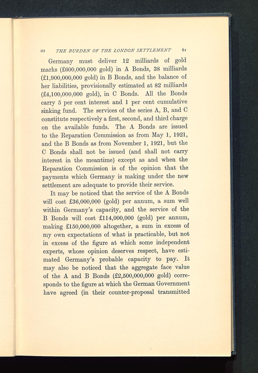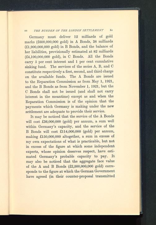 It may be noticed that the service of the A Bondswill cost £36,000,000 (gold) per annum, a sum wellwithin Germany 's capacity, and the service of theB Bonds will cost £114,000,000 (gold) per annum,making £150,000,000 altogether, a sum in excess ofmy own expectations of what is practicable, but notin excess of the figure at which some independentexperts, whose opinion deserves respect, have esti-mated Germany 's probable capacity to pay. Itmay also be noticed that the aggregate face valueof the A and B Bonds (£2,500,000,000 gold) corre-sponds to the figure at which the German Governmenthave agreed (in their counter-proposal transmitted