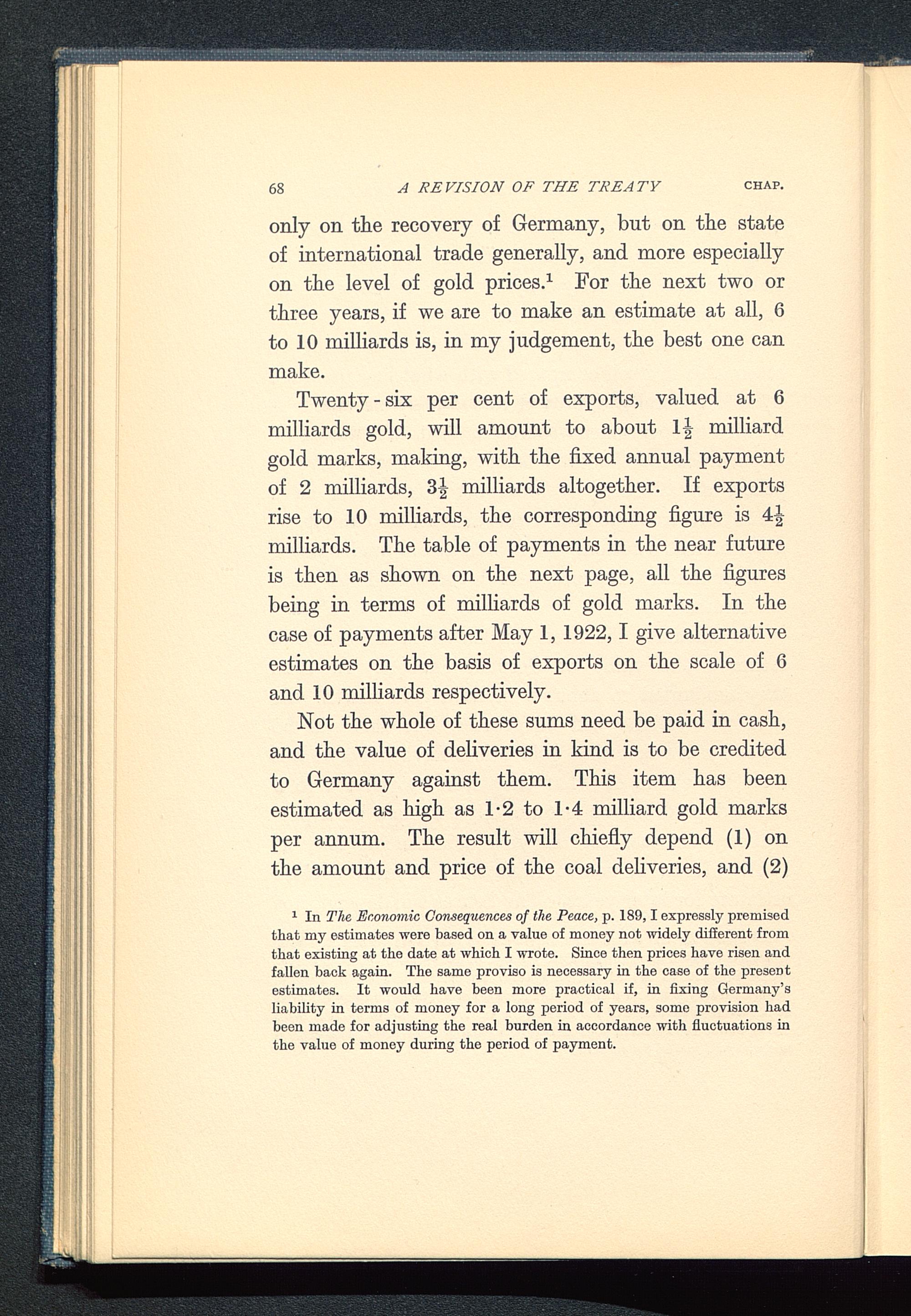 1 In Tlie Economic Consequences of the Peace, p. 189,1 expressly premisedthat my estimates were based on a value of money not widely different fromthat existing at the date at which I wrote. Since then prices have risen andfallen back again. The same proviso is necessary in the case of the presentestimates. It would have been more practical if, in fixing Germany 'sliability in terms of money for a long period of years, some provision hadbeen made for adjusting the real burden in accordance with fluctuations inthe value of money during the period of payment.