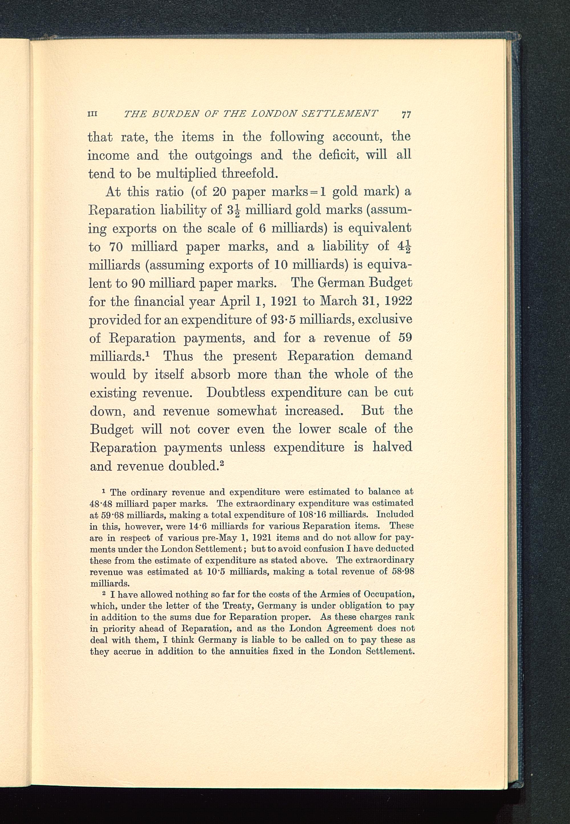 2 I have allowed nothing so far for the costs of the Armies of Occupation,which, under the letter of the Treaty, Germany is under obligation to payin addition to the sums due for Reparation proper. As these charges rankin priority ahead of Reparation, and as the London Agreement does notdeal with them, I think Germany is liable to be called on to pay these asthey accrue in addition to the annuities fixed in the London Settlement.