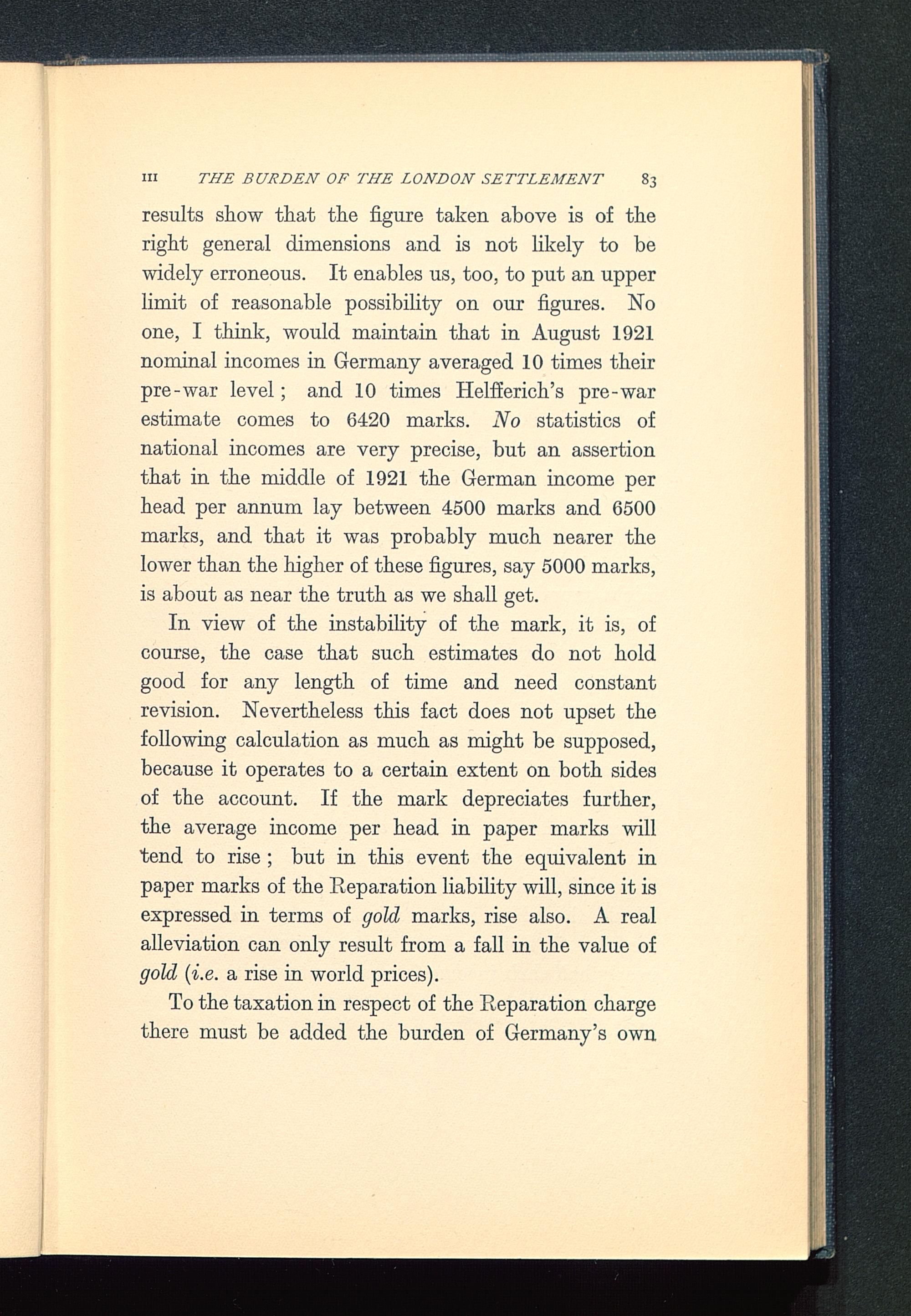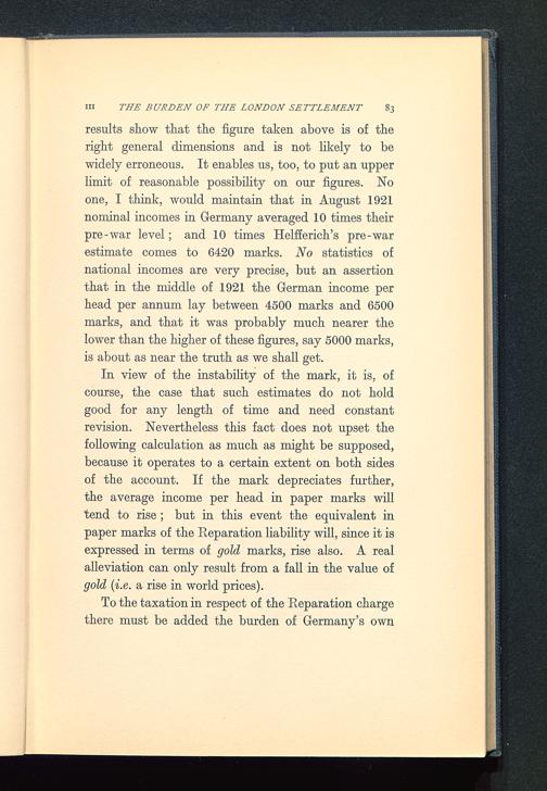 results show that the figure taken above is of theright general dimensions and is not likely to bewidely erroneous. It enables us, too, to put an upperlimit of reasonable possibility on our figures. Noone, I think, would maintain that in August 1921nominal incomes in Germany averaged 10 times theirpre-war level; and 10 times Helfferich 's pre-warestimate comes to 6420 marks. No statistics ofnational incomes are very precise, but an assertionthat in the middle of 1921 the German income perhead per annum lay between 4500 marks and 6500marks, and that it was probably much nearer thelower than the higher of these figures, say 5000 marks,is about as near the truth as we shall get.