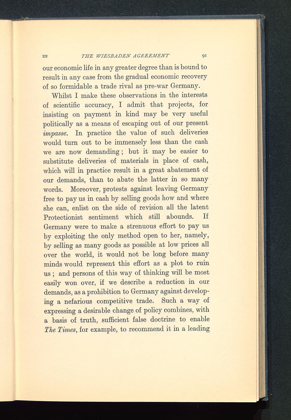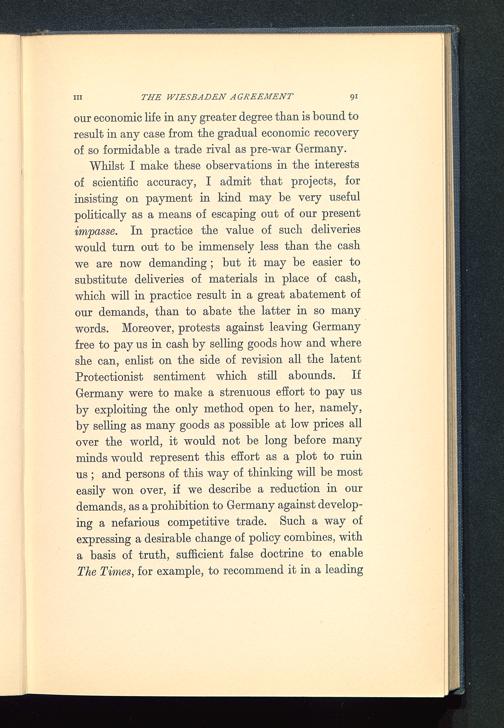 Whilst I make these observations in the interestsof scientific accuracy, I admit that projects, forinsisting on payment in kind may be very usefulpolitically as a means of escaping out of our presentimpasse. In practice the value of such deliverieswould turn out to be immensely less than the cashwe are now demanding ; but it may be easier tosubstitute deliveries of materials in place of cash,which will in practice result in a great abatement ofour demands, than to abate the latter in so manywords. Moreover, protests against leaving Germany free to pay us in cash by selling goods how and whereshe can, enlist on the side of revision all the latentProtectionist sentiment which still abounds. IfGermany were to make a strenuous effort to pay usby exploiting the only method open to her, namely,by selling as many goods as possible at low prices allover the world, it would not be long before manyminds would represent this effort as a plot to ruinus ; and persons of this way of thinking will be mosteasily won over, if we describe a reduction in ourdemands, as a prohibition to Germany against develop-ing a nefarious competitive trade. Such a way ofexpressing a desirable change of policy combines, witha basis of truth, sufficient false doctrine to enableThe Times, for example, to recommend it in a leading