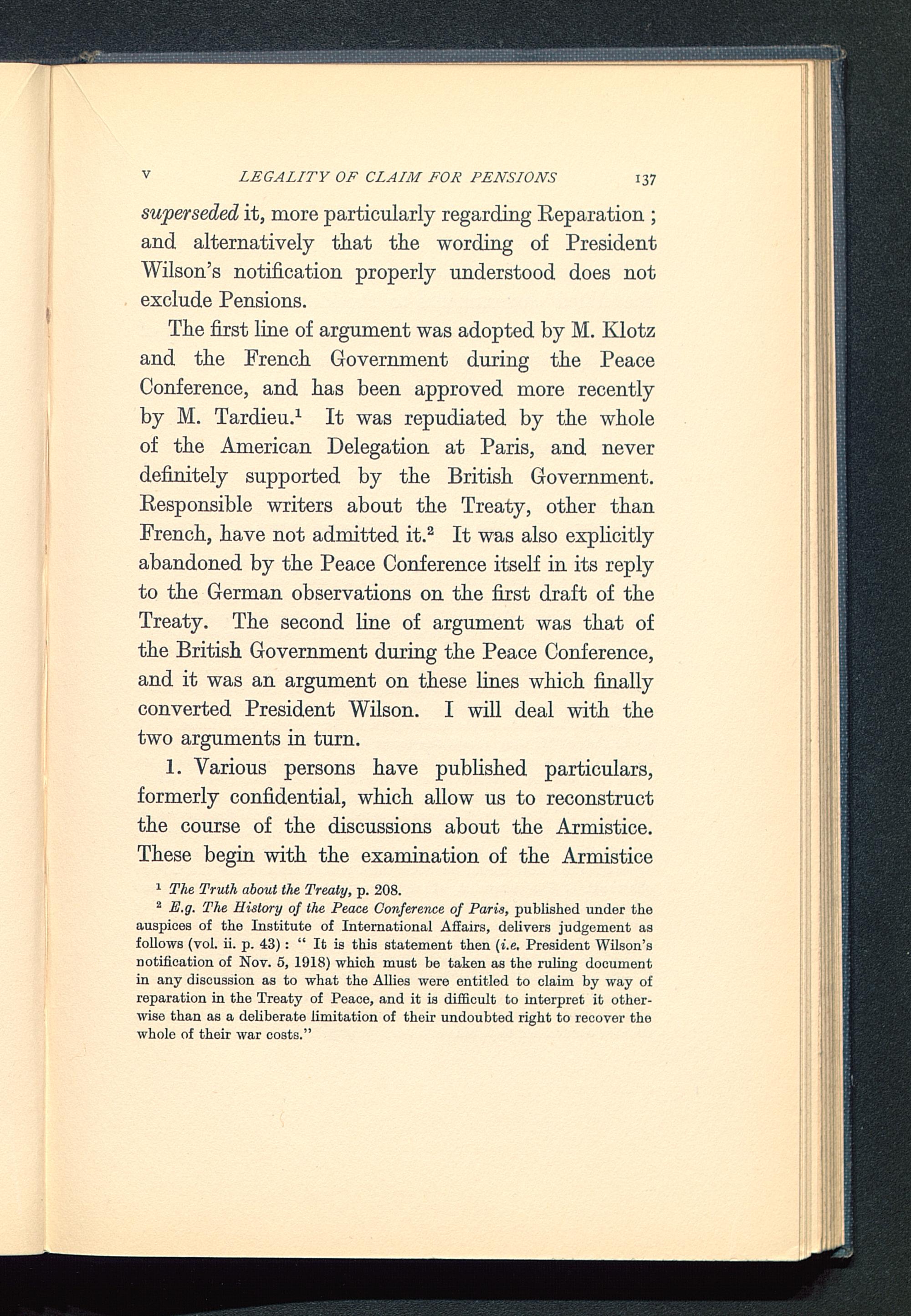 The first line of argument was adopted by M. Klotzand the French Government during the PeaceConference , and has been approved more recentlyby M. Tardieu. 1 It was repudiated by the wholeof the American Delegation at Paris, and neverdefinitely supported by the British Government.Responsible writers about the Treaty, other thanFrench, have not admitted it. 2 It was also explicitlyabandoned by the Peace Conference itself in its replyto the German observations on the first draft of theTreaty. The second line of argument was that ofthe British Government during the Peace Conference, and it was an argument on these lines which finallyconverted President Wilson. I will deal with thetwo arguments in turn.