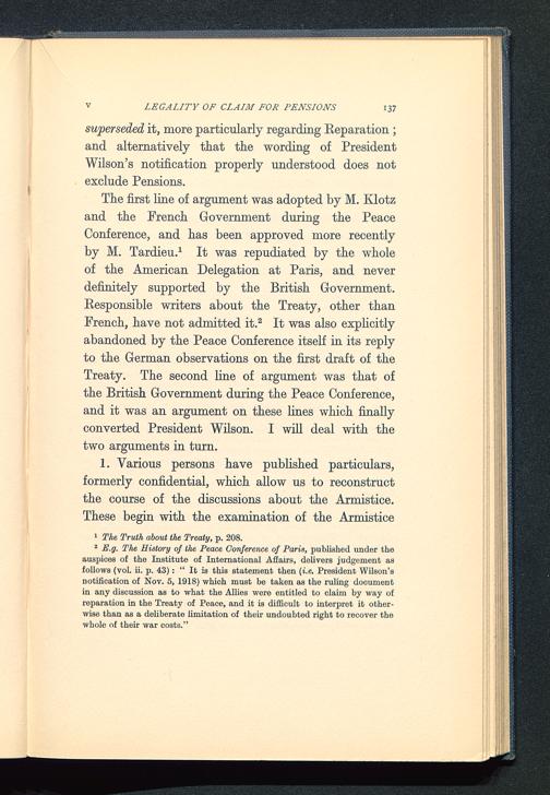 2 E.g. The History of the Peace Conference of Paris, published under theauspices of the Institute of International Affairs, delivers judgement asfollows (vol. ii. p. 43) : " It is this statement then (i.e. President Wilson 'snotification of Nov. 5, 1918) which must be taken as the ruling documentin any discussion as to what the Allies were entitled to claim by way ofreparation in the Treaty of Peace, and it is difficult to interpret it other-wise than as a deliberate limitation of their undoubted right to recover thewhole of their war costs."