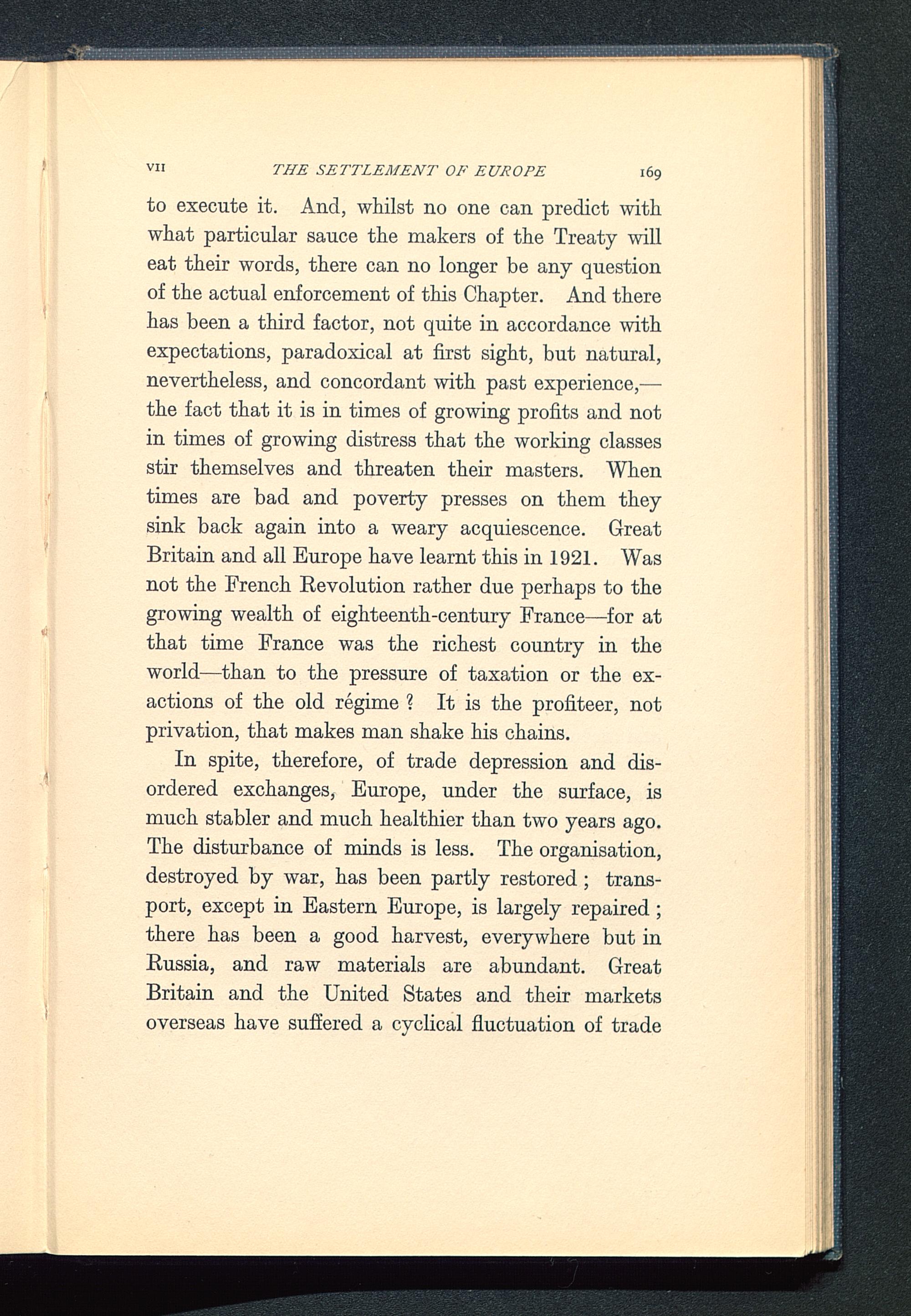 to execute it. And, whilst no one can predict with,what particular sauce the makers of the Treaty willeat their words, there can no longer be any questionof the actual enforcement of this Chapter. And therehas been a third factor, not quite in accordance withexpectations, paradoxical at first sight, but natural,nevertheless, and concordant with past experience,—the fact that it is in times of growing profits and notin times of growing distress that the working classesstir themselves and threaten their masters. Whentimes are bad and poverty presses on them theysink back again into a weary acquiescence. GreatBritain and all Europe have learnt this in 1921. Wasnot the French Eevolution rather due perhaps to thegrowing wealth of eighteenth-century France —for atthat time France was the richest country in theworld—than to the pressure of taxation or the ex-actions of the old regime ? It is the profiteer, notprivation, that makes man shake his chains.