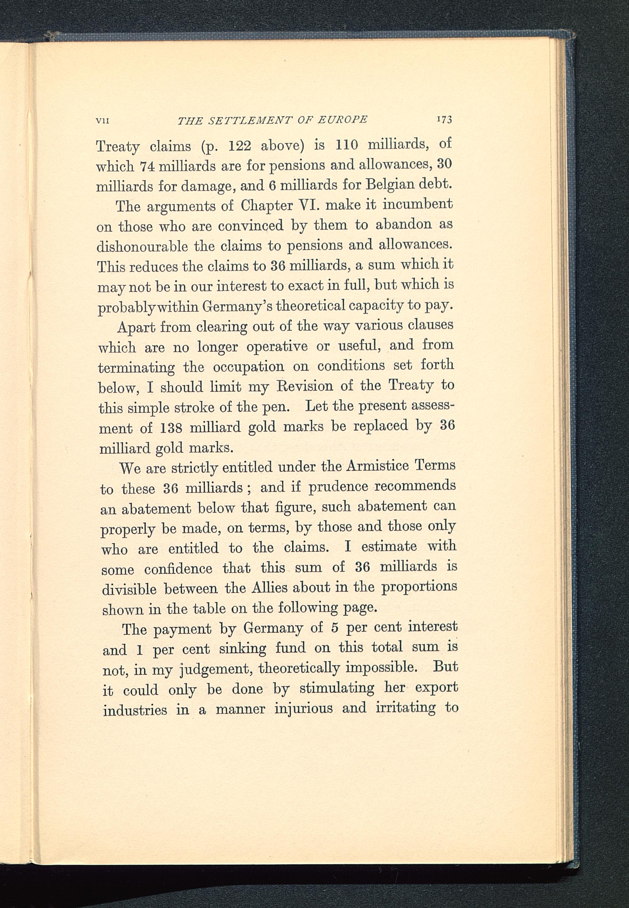 The arguments of Chapter VI. make it incumbenton those who are convinced by them to abandon asdishonourable the claims to pensions and allowances.This reduces the claims to 36 milliards, a sum which itmay not be in our interest to exact in full, but which isprobably within Germany 's theoretical capacity to pay.