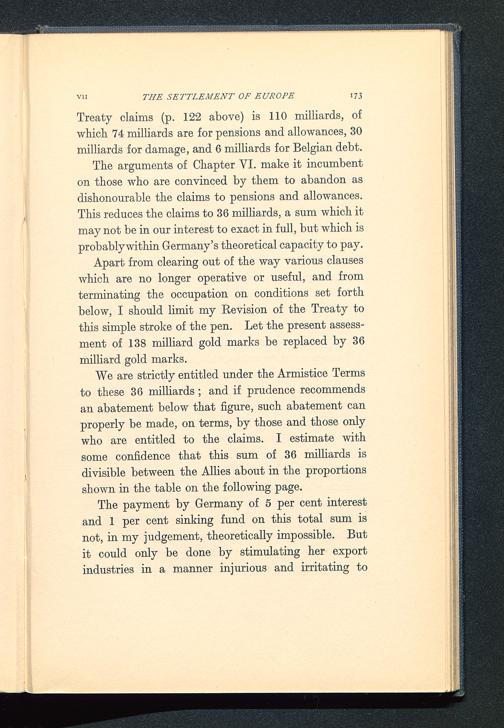 Apart from clearing out of the way various clauseswhich are no longer operative or useful, and fromterminating the occupation on conditions set forthbelow, I should limit my Revision of the Treaty tothis simple stroke of the pen. Let the present assess-ment of 138 milliard gold marks be replaced by 36milliard gold marks.