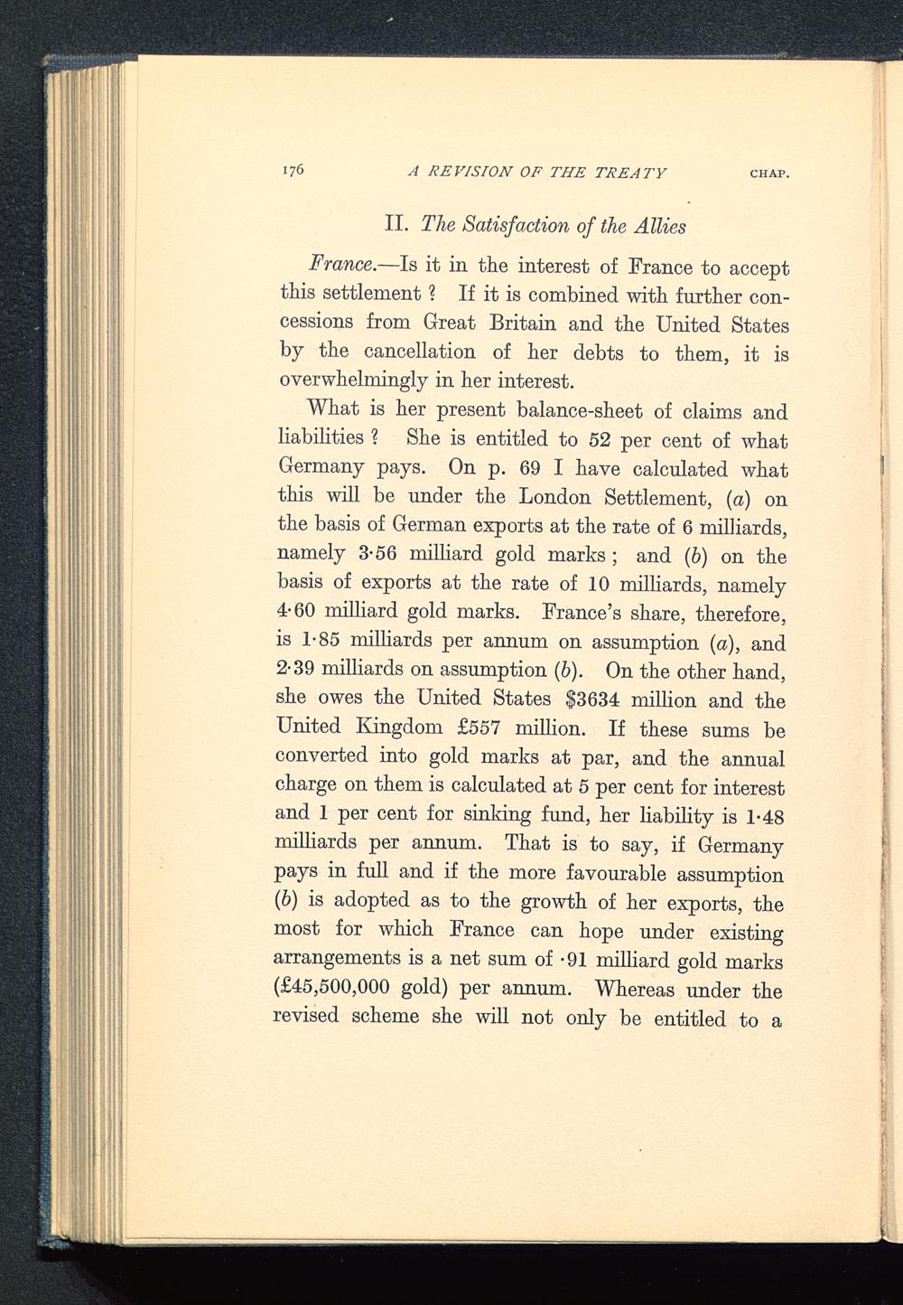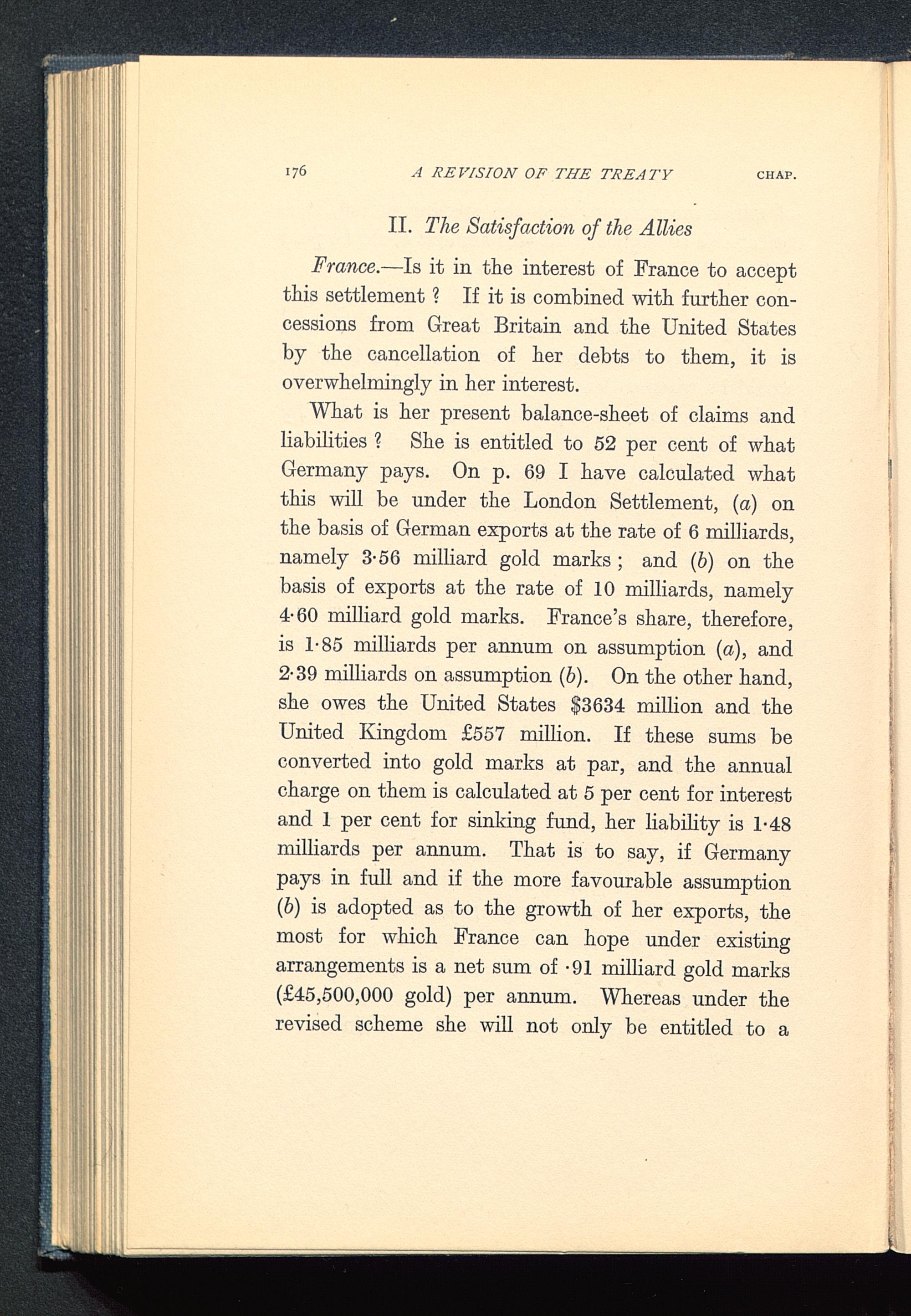 What is her present balance-sheet of claims andliabilities ? She is entitled to 52 per cent of whatGermany pays. On p. 69 I have calculated whatthis will be under the London Settlement, (a) onthe basis of German exports at the rate of 6 milliards,namely 3-56 milliard gold marks ; and (b) on thebasis of exports at the rate of 10 milliards, namely4-60 milliard gold marks. France 's share, therefore,is 1-85 milliards per annum on assumption (a), and2-39 milliards on assumption (b). On the other hand,she owes the United States $3634 million and theUnited Kingdom £557 million. If these sums beconverted into gold marks at par, and the annualcharge on them is calculated at 5 per cent for interestand 1 per cent for sinking fund, her liability is 1-48milliards per annum. That is to say, if Germany pays in full and if the more favourable assumption(b) is adopted as to the growth of her exports, themost for which France can hope under existingarrangements is a net sum of -91 milliard gold marks(£45,500,000 gold) per annum. Whereas under therevised scheme she will not only be entitled to a