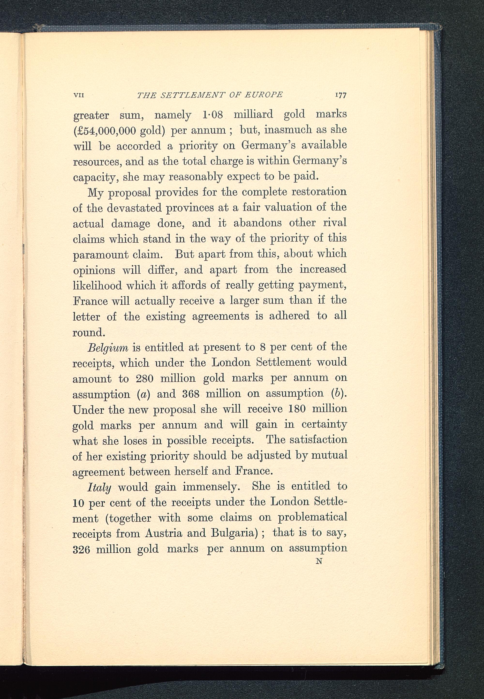 greater sum, namely 1-08 milliard gold marks(£54,000,000 gold) per annum ; but, inasmuch, as shewill be accorded a priority on Germany 's availableresources, and as the total charge is within Germany 'scapacity, she may reasonably expect to be paid.