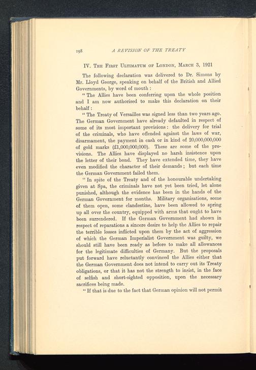 " In spite of the Treaty and of the honourable undertakinggiven at Spa, the criminals have not yet been tried, let alonepunished, although the evidence has been in the hands of theGerman Government for months. Military organisations, someof them open, some clandestine, have been allowed to springup all over the country, equipped with arms that ought to havebeen surrendered. If the German Government had shown inrespect of reparations a sincere desire to help the Allies to repairthe terrible losses inflicted upon them by the act of aggressionof which the German Imperialist Government was guilty, weshould still have been ready as before to make all allowancesfor the legitimate difficulties of Germany . But the proposalsput forward have reluctantly convinced the Allies either thatthe German Government does not intend to carry out its Treaty obligations, or that it has not the strength to insist, in the faceof selfish and short-sighted opposition, upon the necessarysacrifices being made.