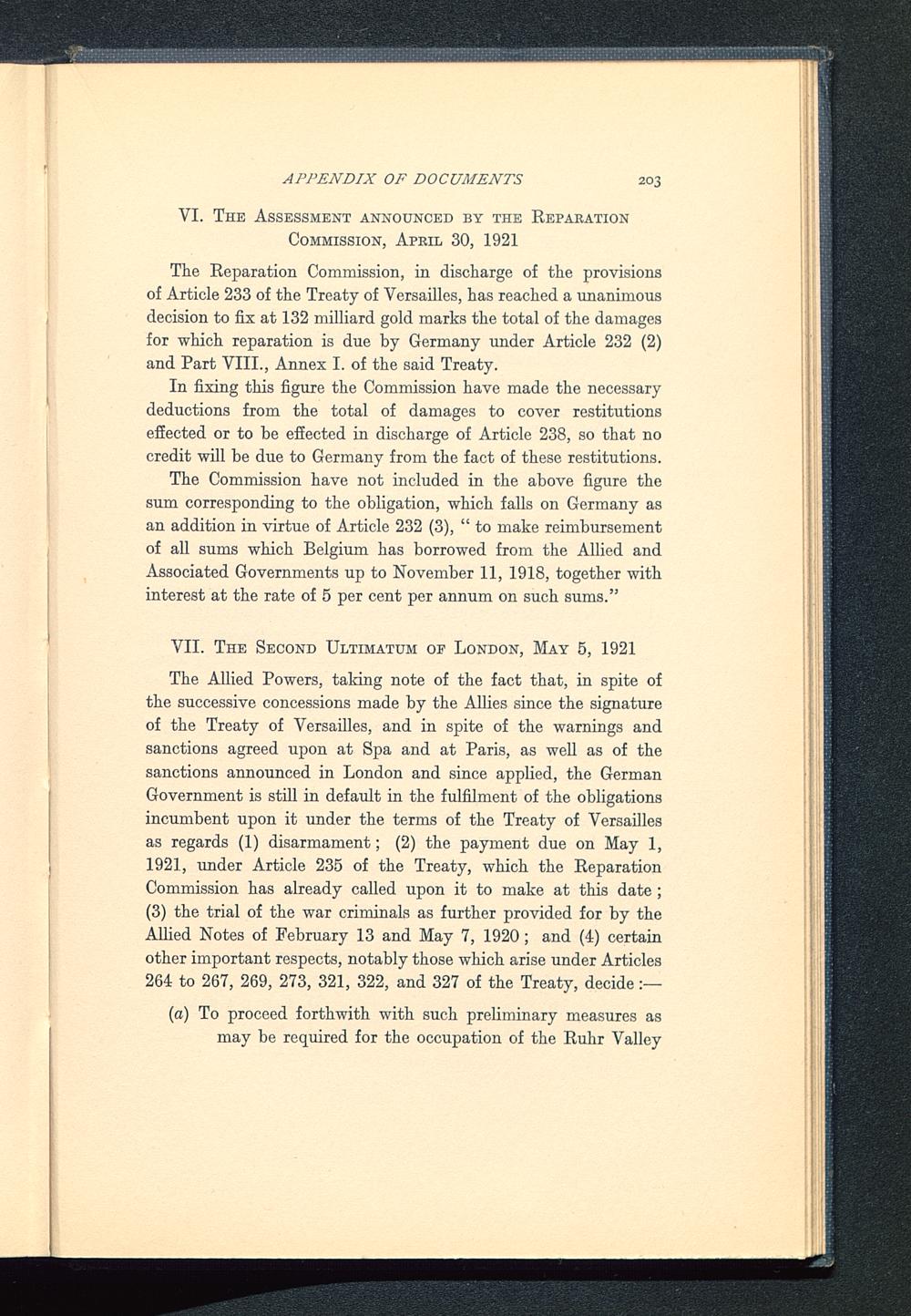 The Allied Powers, taking note of the fact that, in spite ofthe successive concessions made by the Allies since the signatureof the Treaty of Versailles , and in spite of the warnings andsanctions agreed upon at Spa and at Paris, as well as of thesanctions announced in London and since applied, the GermanGovernment is still in default in the fulfilment of the obligationsincumbent upon it under the terms of the Treaty of Versailles as regards (1) disarmament; (2) the payment due on May 1,1921, under Article 235 of the Treaty , which the ReparationCommission has already called upon it to make at this date ;(3) the trial of the war criminals as further provided for by theAllied Notes of February 13 and May 7, 1920 ; and (4) certainother important respects, notably those which arise under Articles264 to 267, 269, 273, 321, 322, and 327 of the Treaty , decide :—