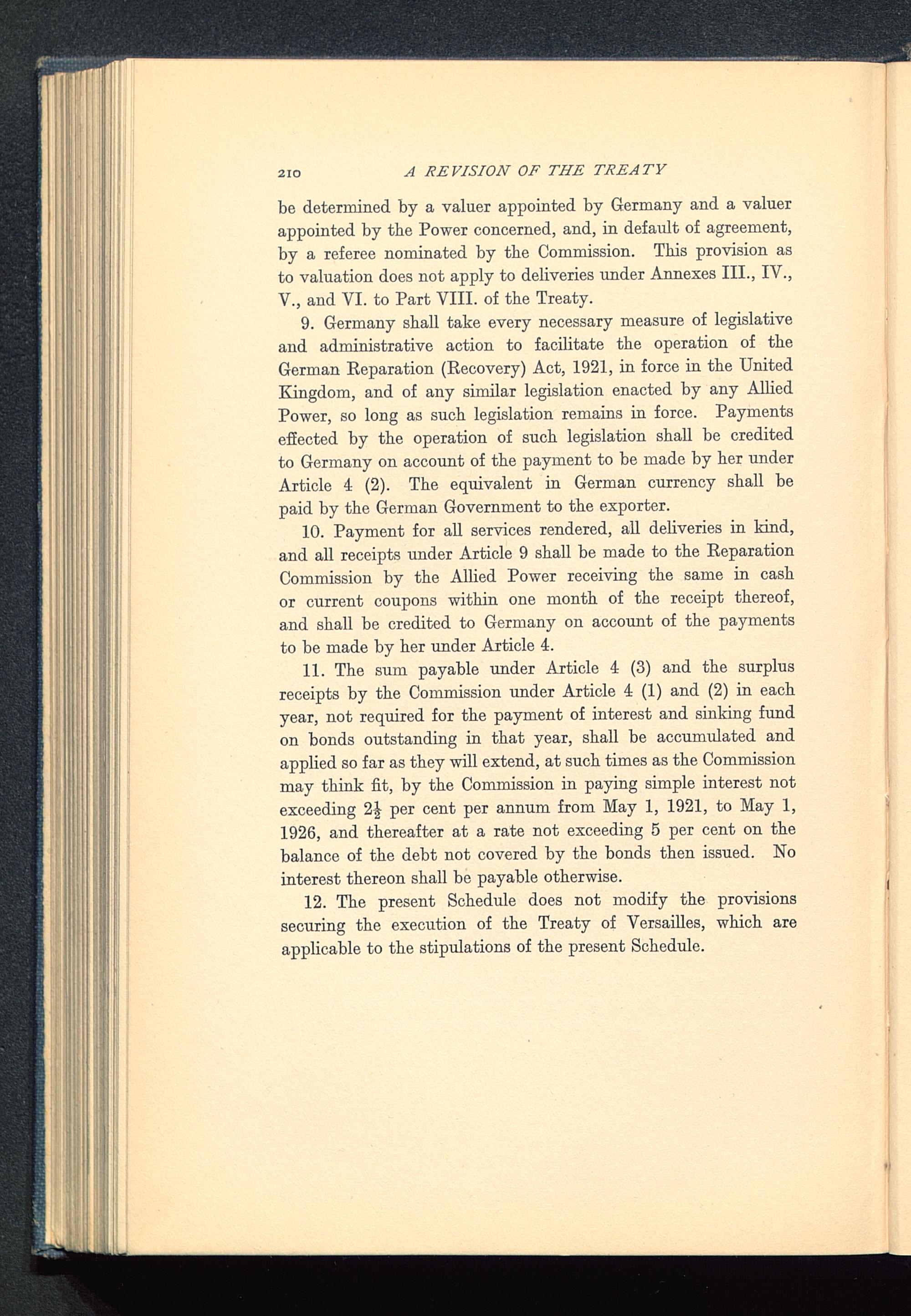9. Germany shall take every necessary measure of legislativeand administrative action to facilitate the operation of theGerman Reparation (Recovery) Act, 1921, in force in the UnitedKingdom , and of any similar legislation enacted by any AlliedPower, so long as such legislation remains in force. Paymentseffected by the operation of such legislation shall be creditedto Germany on account of the payment to be made by her underArticle 4 (2). The equivalent in German currency shall bepaid by the German Government to the exporter.