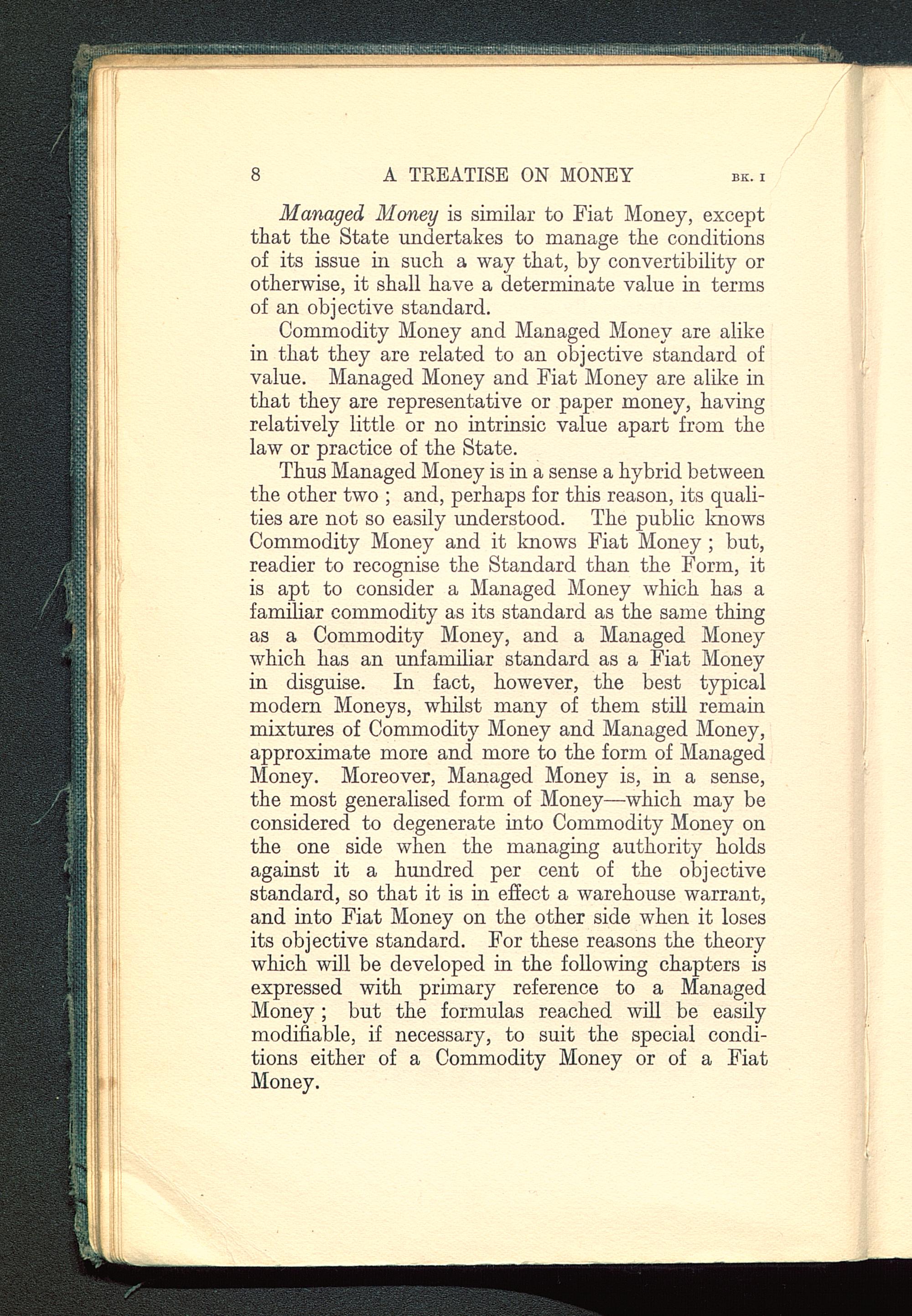 Commodity Money and Managed Money are alikein that they are related to an objective standard ofvalue. Managed Money and Fiat Money are alike inthat they are representative or paper money, havingrelatively little or no intrinsic value apart from thelaw or practice of the State.